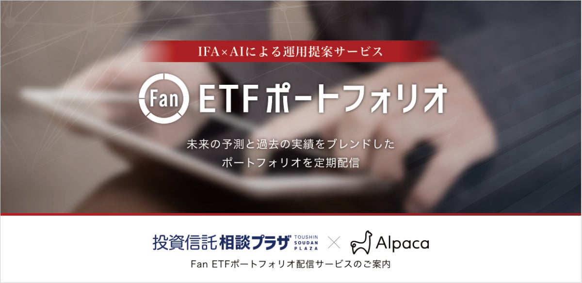 株式会社Fanが運営を行う、投資信託相談プラザはAlpacaJapan株式会社と共同で新たに「Fan ETFポートフォリオ」の提供を開始いたします。のべ2万人以上に対して資産運用コンサルティングサービスを提供してきた投資信託相談プラザと、AIを用いたマーケット分析を得意とするAlpacaJapanが共同で、東証ETFを用いた最適なポートフォリオをご提案いたします。