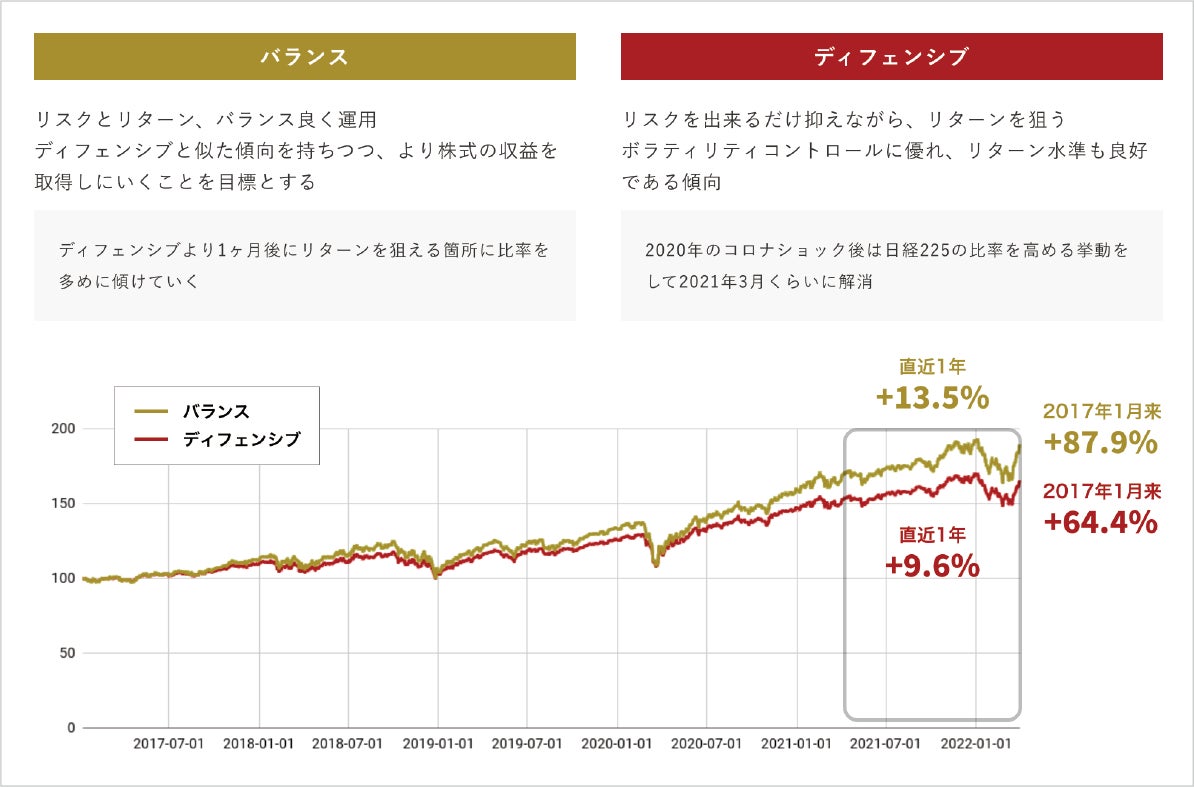 「Fan ETFポートフォリオ」ではリスクとリターンをバランスよく運用する「バランスプラン」と、リスクをできるだけ抑えながらリターンを狙う「ディフェンシブプラン」の2タイプを設定しています。事前のバックテストではディフェンシブプランで収益率64.4%、バランスプランで87.9%※を記録しています。
