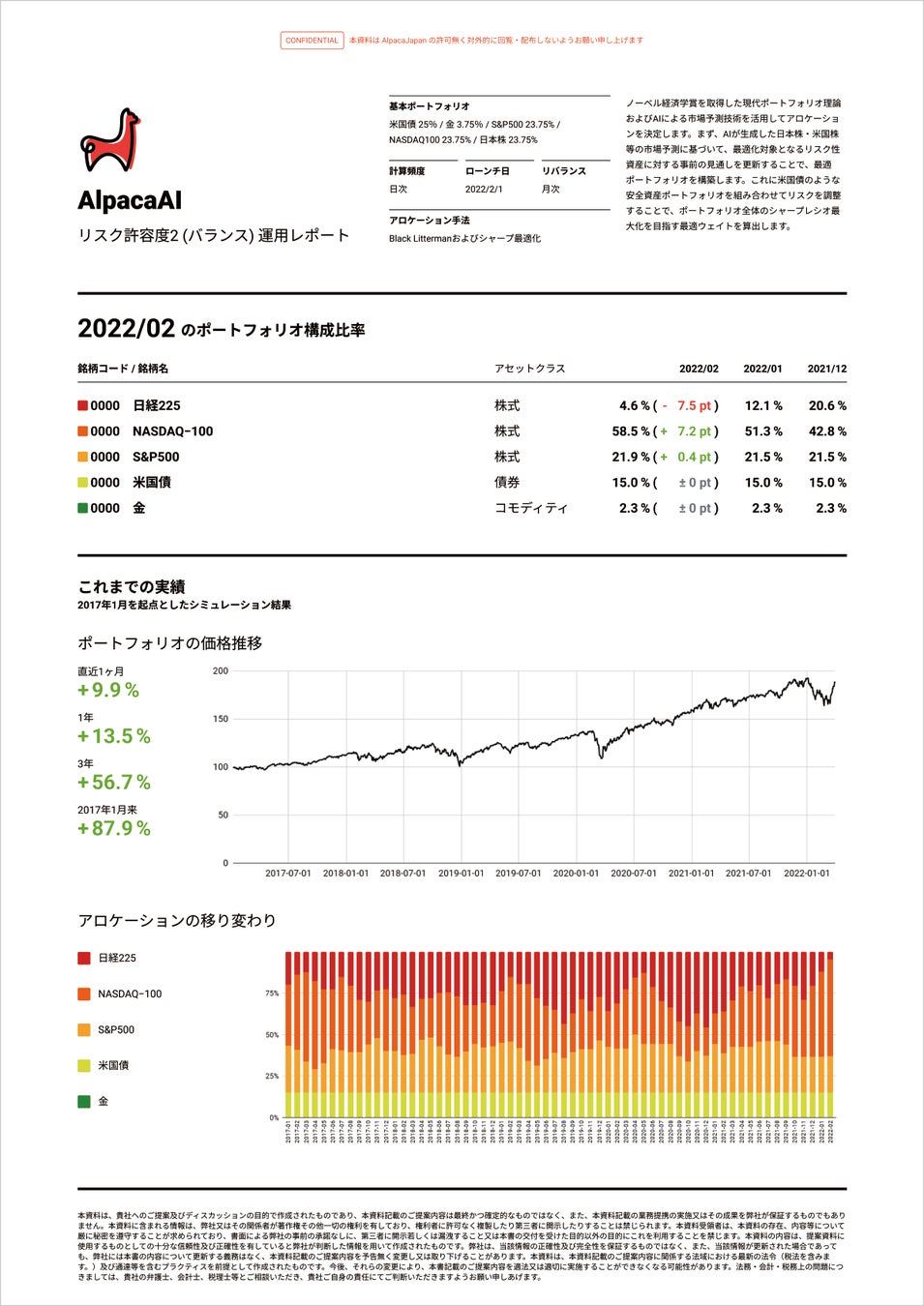毎月月初(毎月3営業日目)にお客様が選択されたプランのレポートをお送りします。お客様はレポートを参考にリバランスをご検討ください。