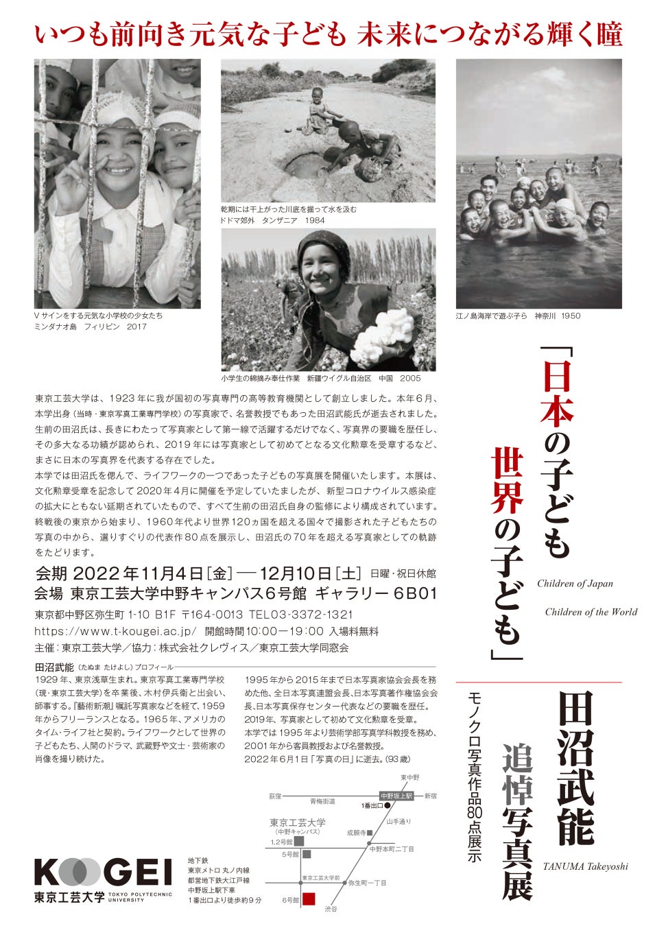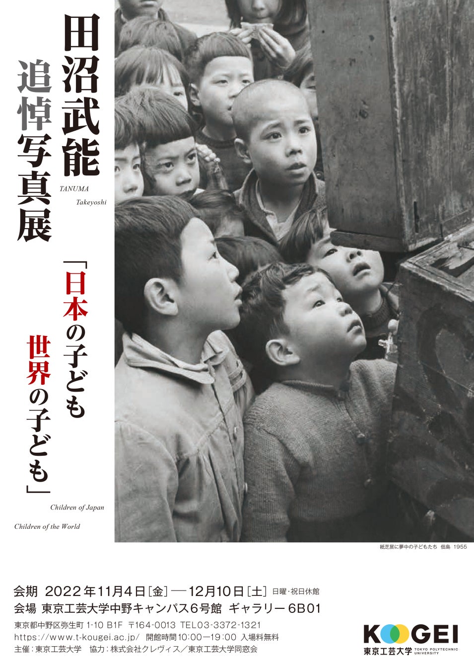 東京工芸大学( 学長:吉野弘章、所在地:東京都中野区 以下、本学)は、本学の卒業生で名誉教授であった写真家の故・田沼武能氏(以下、氏)の追悼写真展「日本の子ども世界の子ども」(以下、本追悼展)を、2022年11月4日(金)から12月10日(土)まで、本学中野キャンパス6号館ギャラリー6B01で開催します。