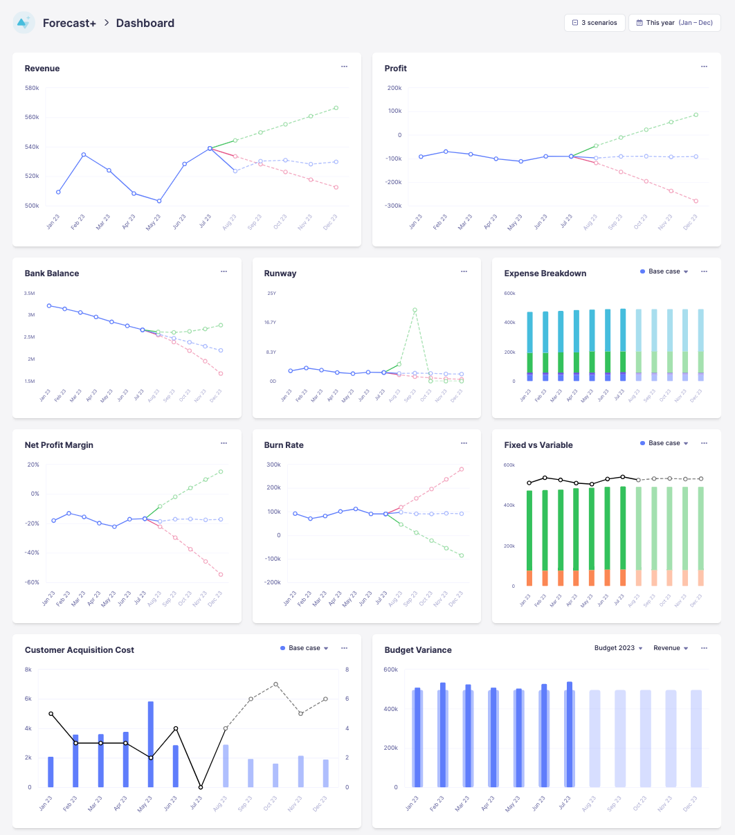 Forecast+は、すべての重要な財務データを1つの場所で管理・提供する高度な財務計画ツールです。経費をどのような割合で使用しているか、顧客獲得コスト(CAC)はどれくらいなのか、口座預金はどれくらい残っているかなど、財務の状態を理解し、ビジネスをコントロールするのに役立てることができます。