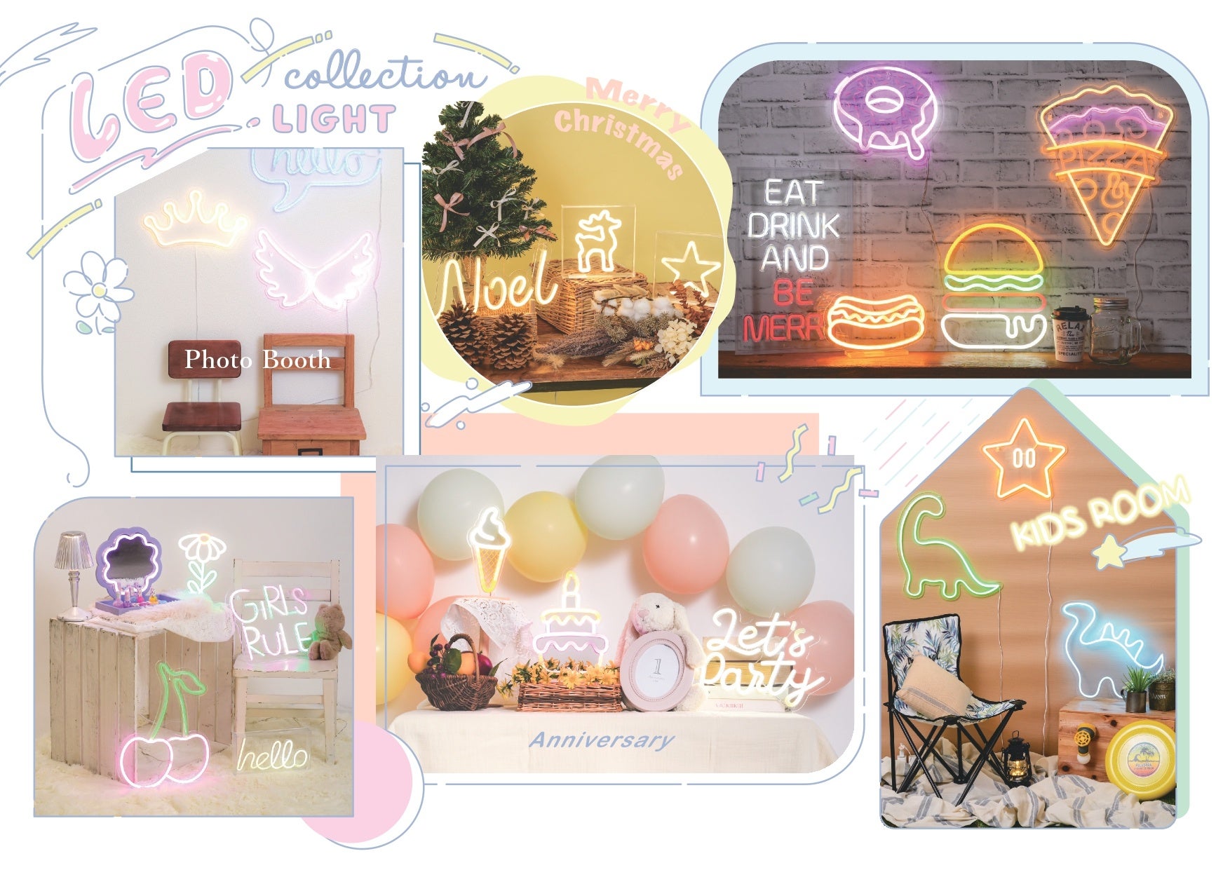 欧米では、キッズルームのインテリアとしてやクリスマスやハロウィンのパーティー・アニバーサリーフォトなどお子様の成長の様々なシーンで活躍しているネオンアート。オリジナリティのあるこだわりのお部屋にあたたかみと優しく柔らかな光で、癒しのひとときをお過ごしいただけます。