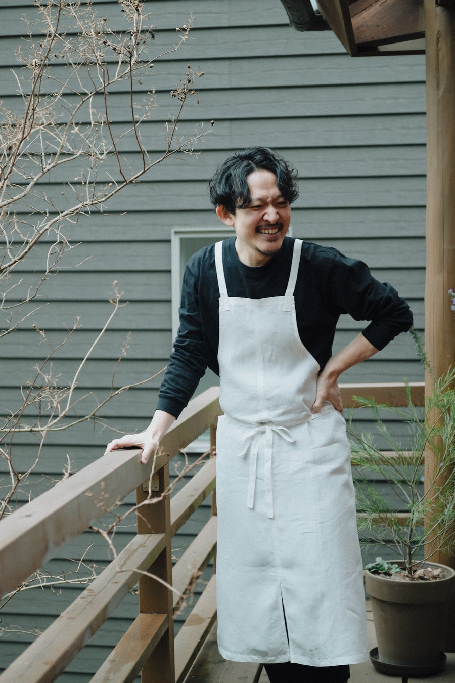 料理や栽培で使用するエプロンは、山道具メーカー〈山と道〉で道具を開発する際に残っていた生地を提供いただき、パタンナーの土川さんにオリジナルのデザインに仕上げていただきました。