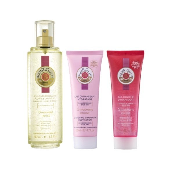 人気の清潔感と華やかさを併せ持つ香り「ジンジャールージュ」が優しく香り立つパフュームオイルに、ミニサイズの同じ香りのシャワージェルとボディローションが付いてくるお得なセット。