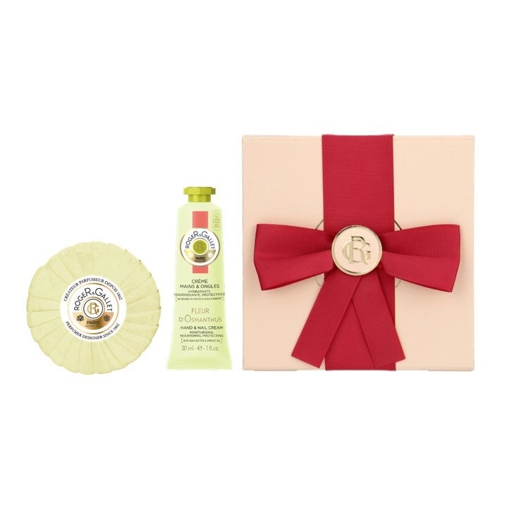 人気のオスマンティウス(金木犀)の香りのソープとハンドクリームをレッドリボンが華やかなボックスにセット。気軽な贈り物におすすめのギフトセットです。