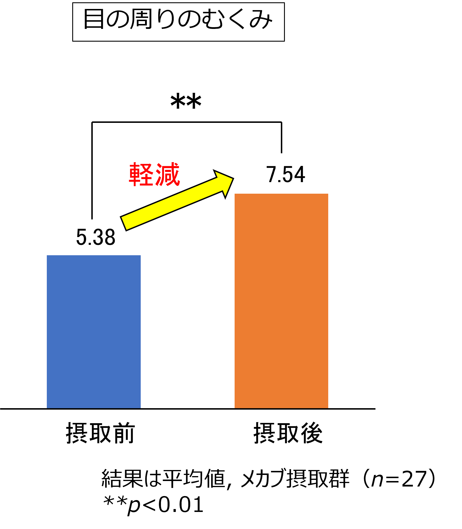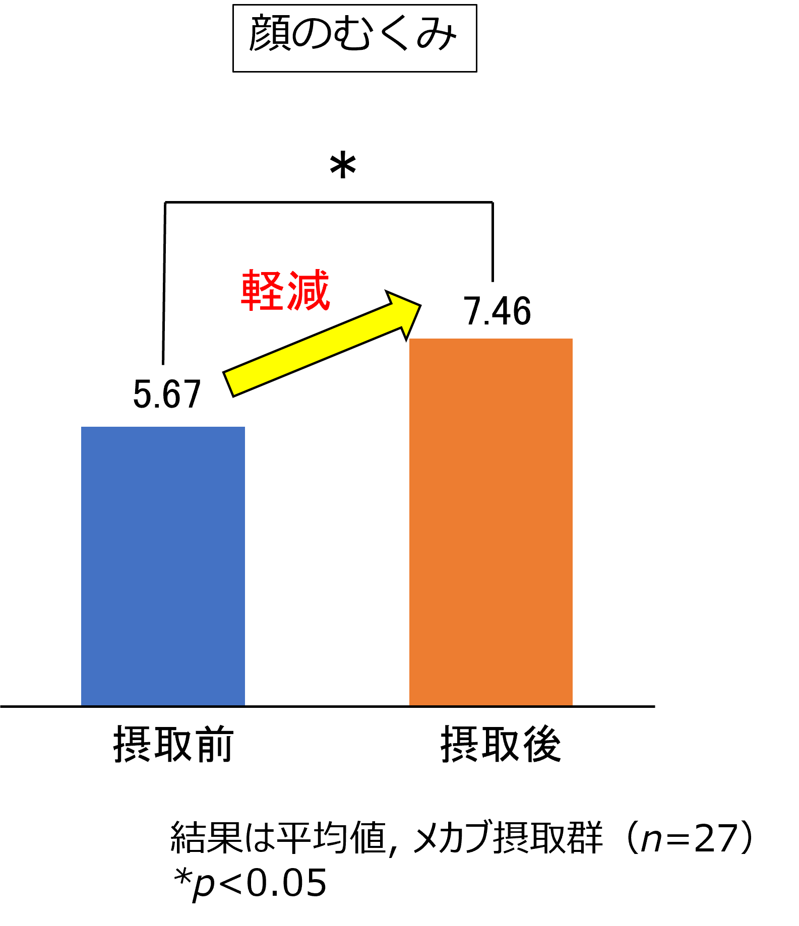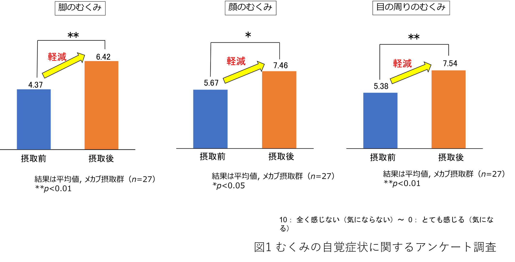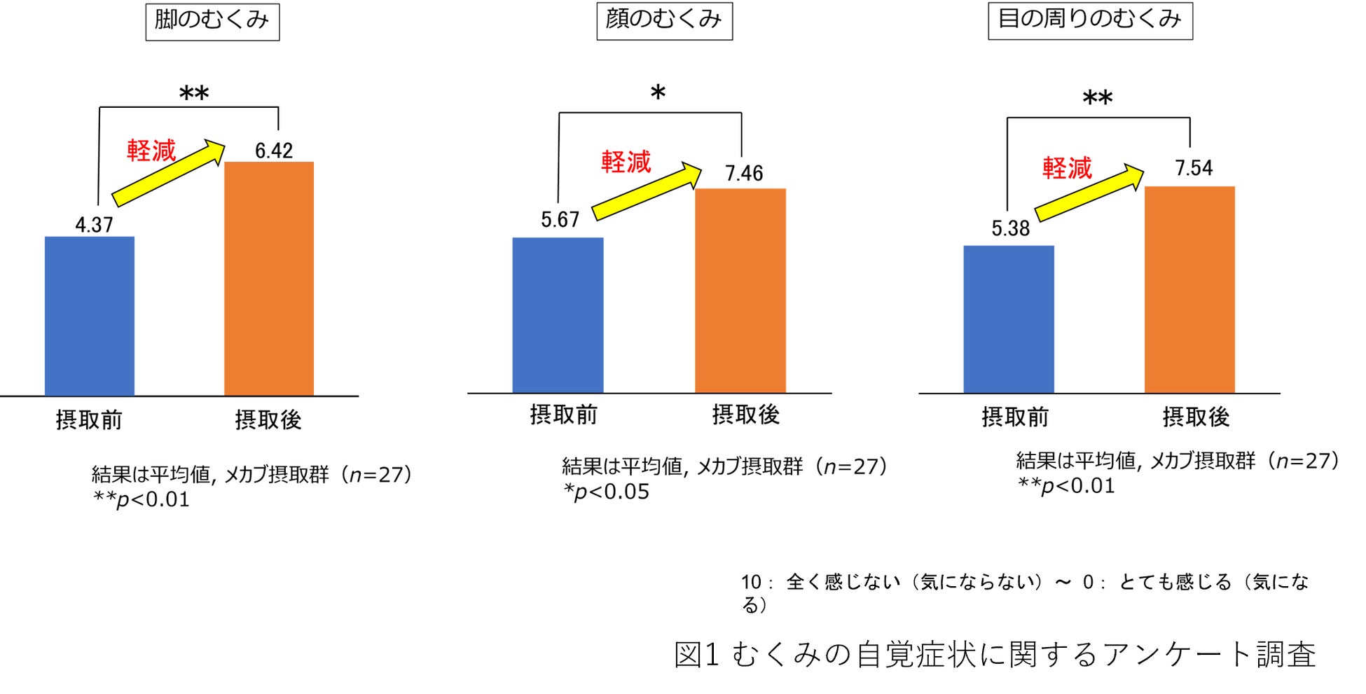その結果、脚や顔のむくみが軽減されることが示唆されました。すなわち、被験者全員に対して実施したむくみの自覚症状に関するアンケート調査では、めかぶを毎日摂取していたグループは、試験開始前と試験終了後に評価した「脚のむくみ」や「顔のむくみ」、「目の周りのむくみ」といった11項目の全てにおいて、症状が軽減していると回答しました(図1)。