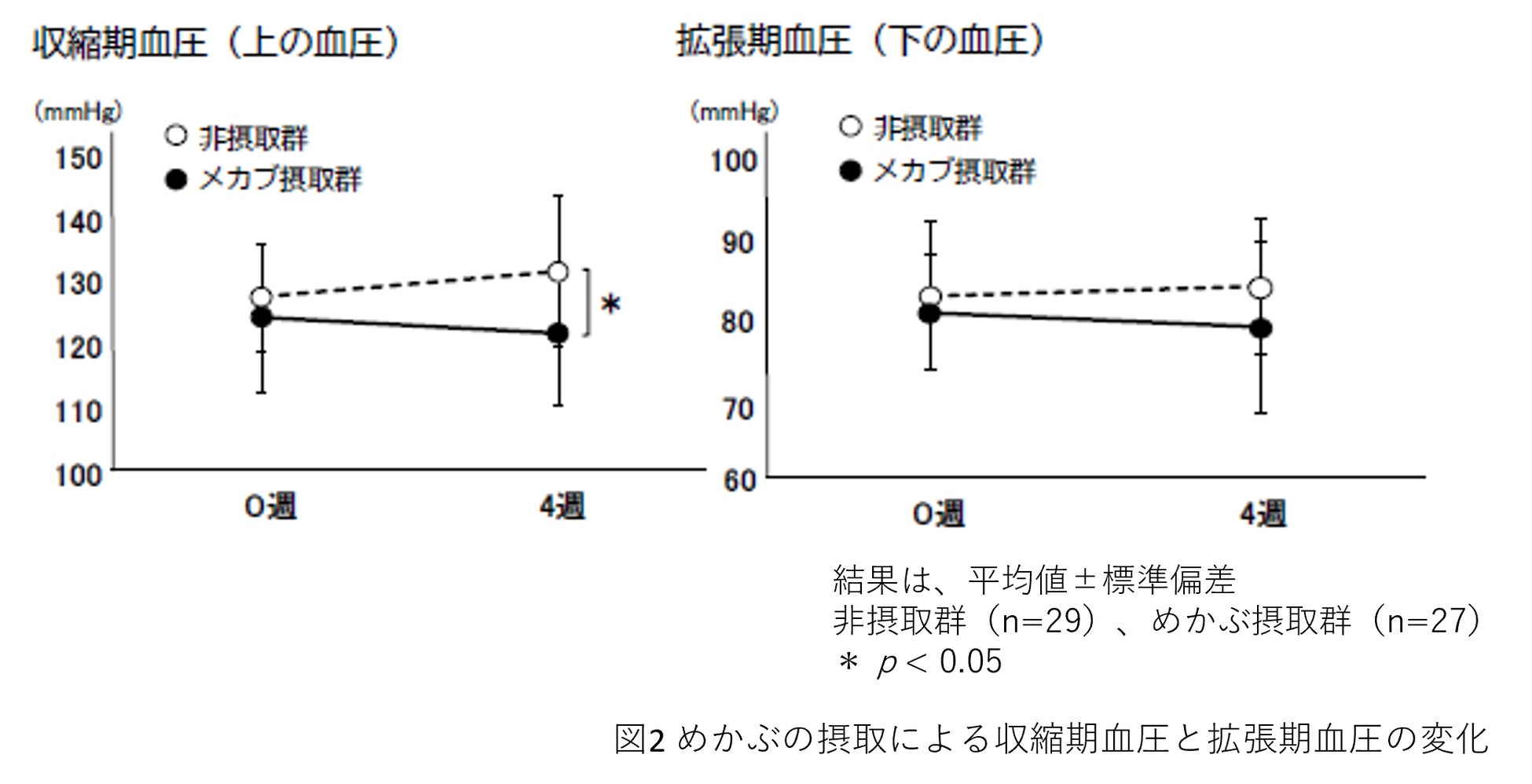 その結果、試験開始前の収縮期血圧が140 mmHg未満の被験者において、 「めかぶファースト®」 を4 週間継続して行うと、収縮期血圧が有意に低値を示し(p<0.05)、拡張期血圧も低値を示す傾向が認められました(図2) 。