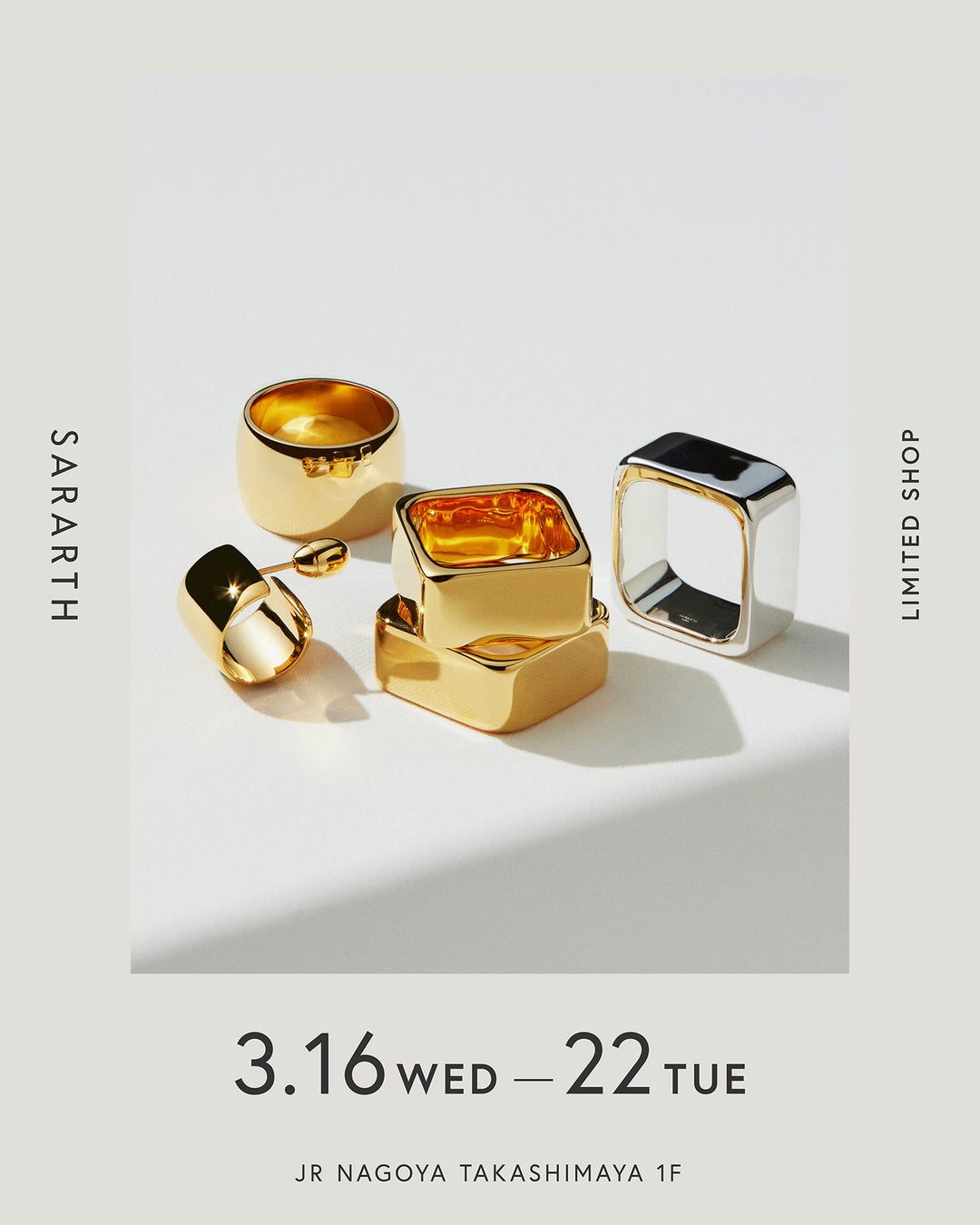 ジュエリーブランド "SARARTH(サラース)" は、ジェイアール名古屋タカシマヤ 1F 婦人アクセサリー売場特設会場にて、3月16日(水) – 3月22日(火)の7日間の期間限定で「SARARTH LIMITED SHOP」を出店いたします。今回、高硬度PURE SILVER 999/24金(K24)プレーティングの2色で展開する各アイテムに加え、シグネチャーコレクション "GLEAM" の新作 "CUBE" を初公開、数量限定で先行発売いたします。