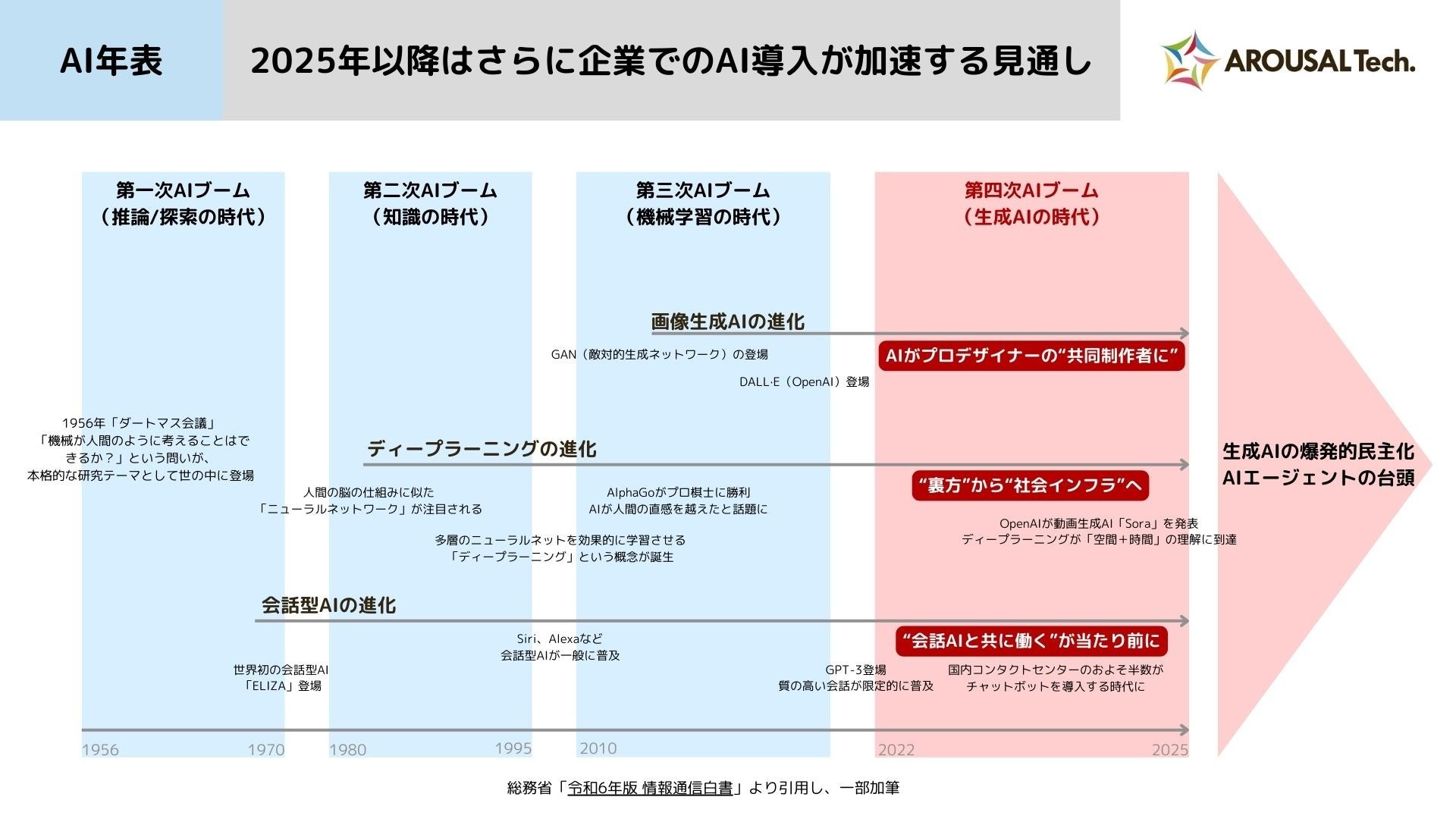 2022〜2023年にかけて大規模言語モデル(LLM)や生成AIが急速に普及し、“AIの民主化”が一気に進みました。クラウド環境ですぐに使える技術が増えたことで、開発部門や研究者だけでなくマーケティング・人事・経理など、社内のあらゆる部門でAIが使われ始めています。