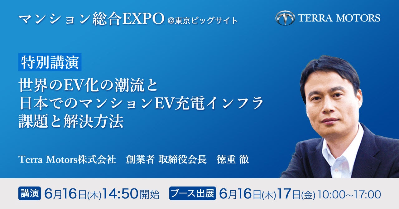 EVをもっと身近にすることを目指して、既設マンションにて導入無料のEV充電インフラ「Terra Charge」(https://terramotors.co.jp/terra-charge/)を提供するTerra Motors株式会社(本社:東京都千代田区、取締役会長:徳重徹 代表取締役社長:上田晃裕、以下 テラモーターズ )は、2022年6月16日(木)、17日(金)に開催されるマンション総合EXPO(主催:マンション総合EXPO実行委員会)にブース出展し、6月16日(木)14時50分より弊社取締役会長徳重徹が講演をいたします。