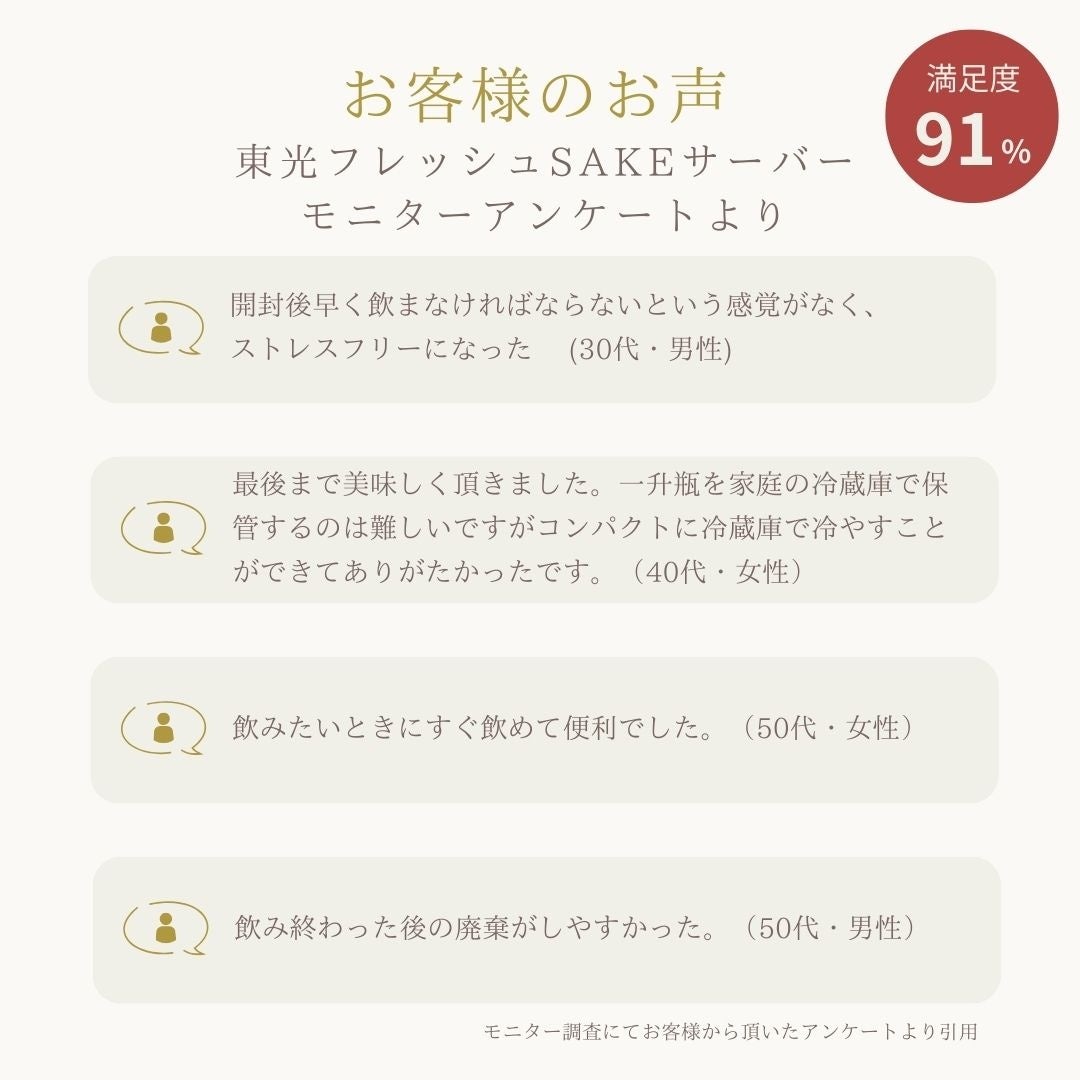 実際に当蔵でボックス型の試作品を作成しモニター調査を行ったところ、お客様より満足度91%の評価を頂きました。また、同調査内にて「冷蔵庫で保管しやすい」、「早めに飲み切らなければというプレッシャーがない」「ゴミが少なくていい」というポジティブなご意見をいただくと共に、「環境負荷が少ない容器」への共感も数多く寄せられました。そのため、酒類業界では一般的な「ボックスとパウチの両方が使い捨て」という様式も見直し、ボックスは何度か繰り返し使っていただきながら、内側のパウチを追加購入いただくスタイルにして発売することといたしました。日本酒がある生活の新しい形として、是非多くの方にお試しいただければ幸いです。