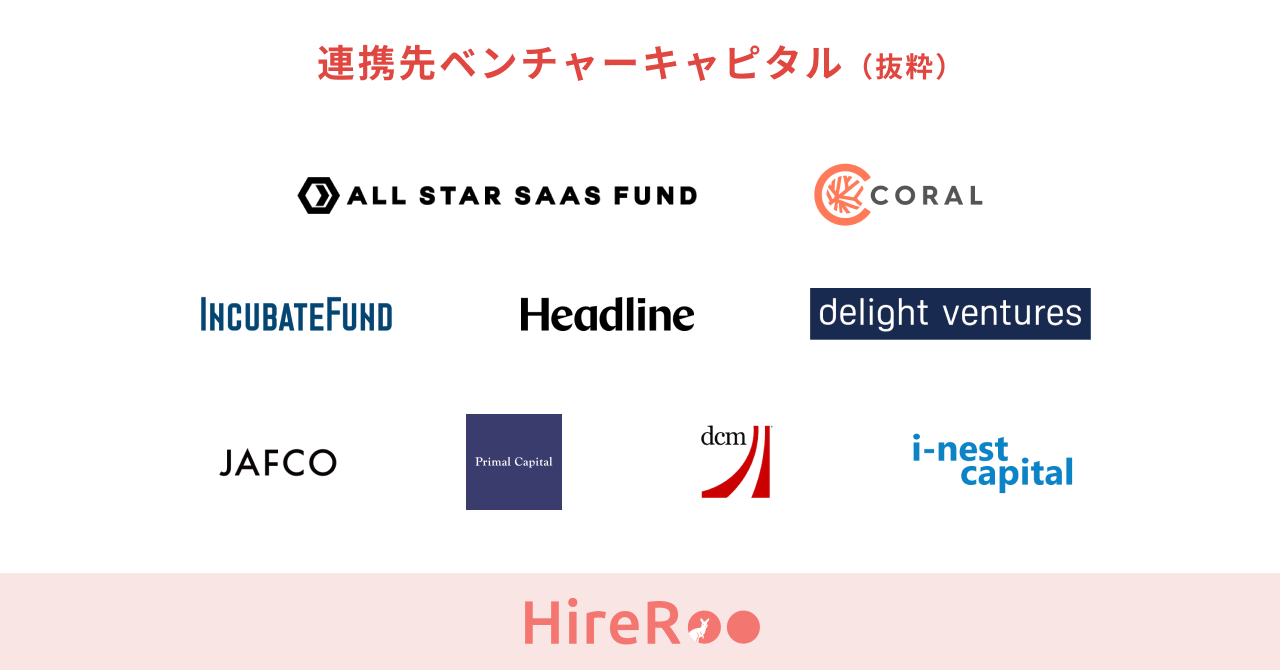 ALL STAR SAAS FUND、Coral Capital、DCMベンチャーズ、デライト・ベンチャーズ、Headline asia、i-nest capital、インキュベイトファンド株式会社、ジャフコ グループ株式会社、Primal Capital