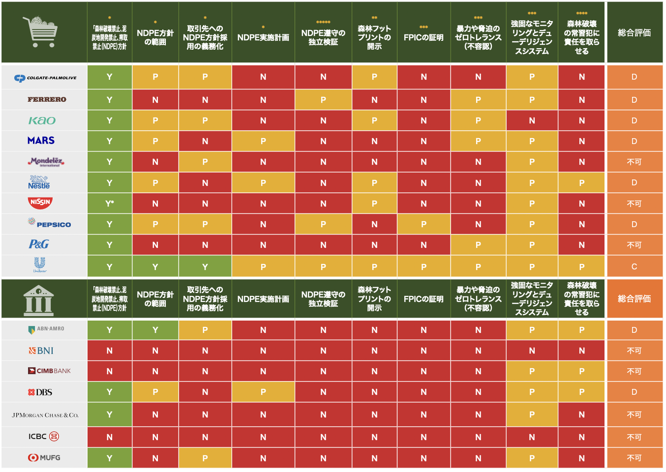 本ランキングは、原材料調達と資金提供を通じて森林破壊のリスクが高いサプライチェーンに関与している消費財企業と銀行で、影響力の大きい消費財企業10社と銀行7社を対象に、各社の方針について森林と人権分野の10項目を20点満点で評価しています。通称「森林リスク産品」と呼ばれる熱帯林産品はパーム油、紙パルプ、牛肉、大豆、カカオ、木材製品などです。17社には日清食品、花王、MUFGの日本企業3社が含まれます。合計得点に合わせてA(18〜20点)、B(15〜17点)、C(12〜14点)、D(5〜11点)、不可(0〜4点)で評価しました。