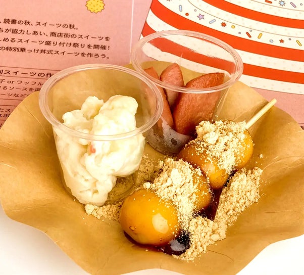 当日は、商店街のイベントコミュニティスペース「アキナイ山王亭」を使用し、小型のマルシェを開催。地域の子ども達による受付会計と検温アルコールのチェックをした後、参加費を支払いコイン3枚と交換。子どもたちが担当する3つのブースで提供される商店街店舗のお団子やワッフルなど、様々なトッピングをコインと交換していきながら盛り付けていき、各々のスペシャルスイーツを作りました。
