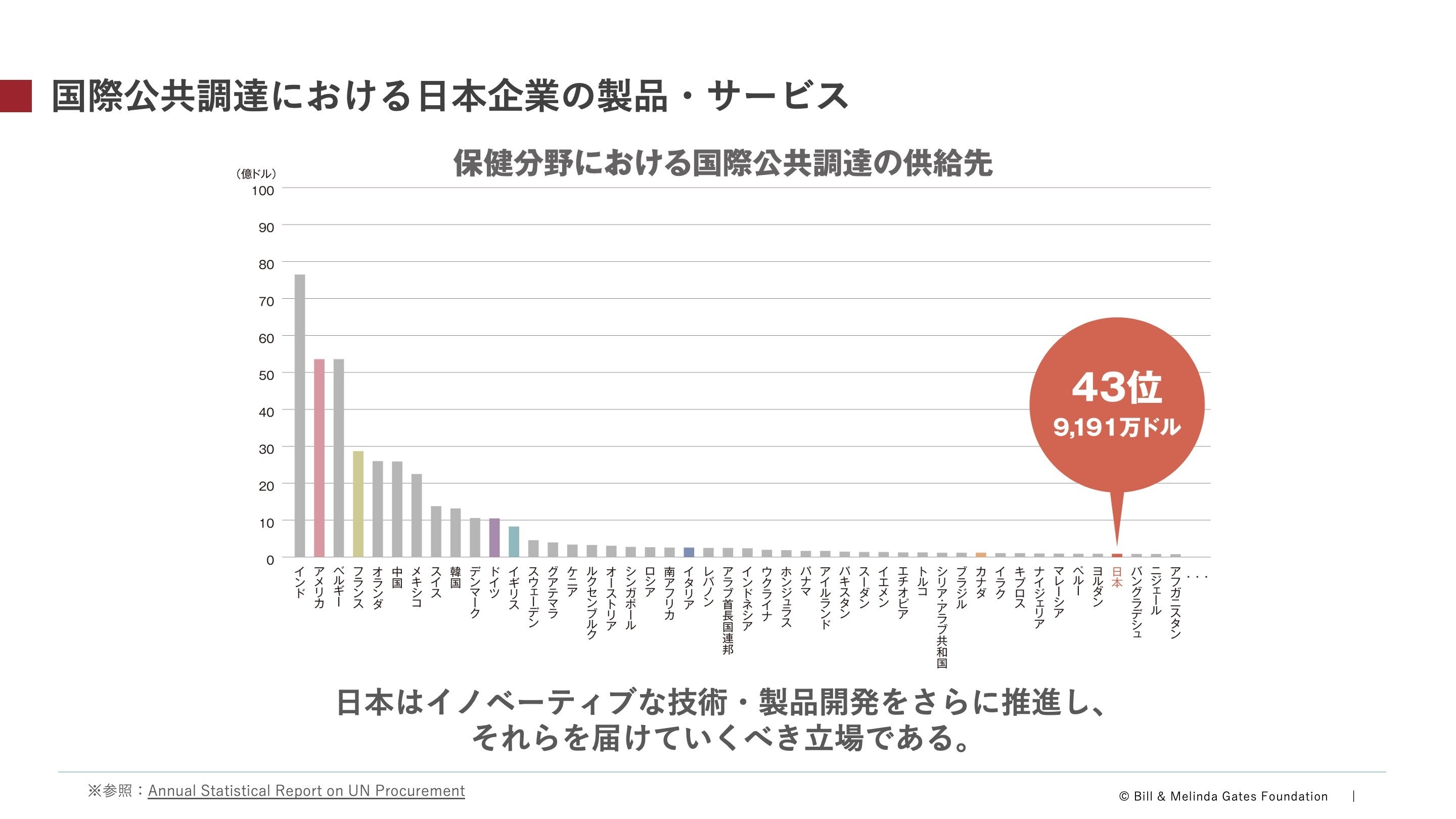 世界における感染症の実態を踏まえて、日本としてできることは、資金投資と、製品普及を通じたイノベーションによるグローバルヘルスへの貢献です。多国間援助における資金投資額の状況や、国際公共調達における保健分野の供給額では、まだ伸び代があると考えています。我々は、さらに日本企業の製品が様々な国際機関や国際公共調達を通じて、グローバルヘルスに貢献していくことを願っています。