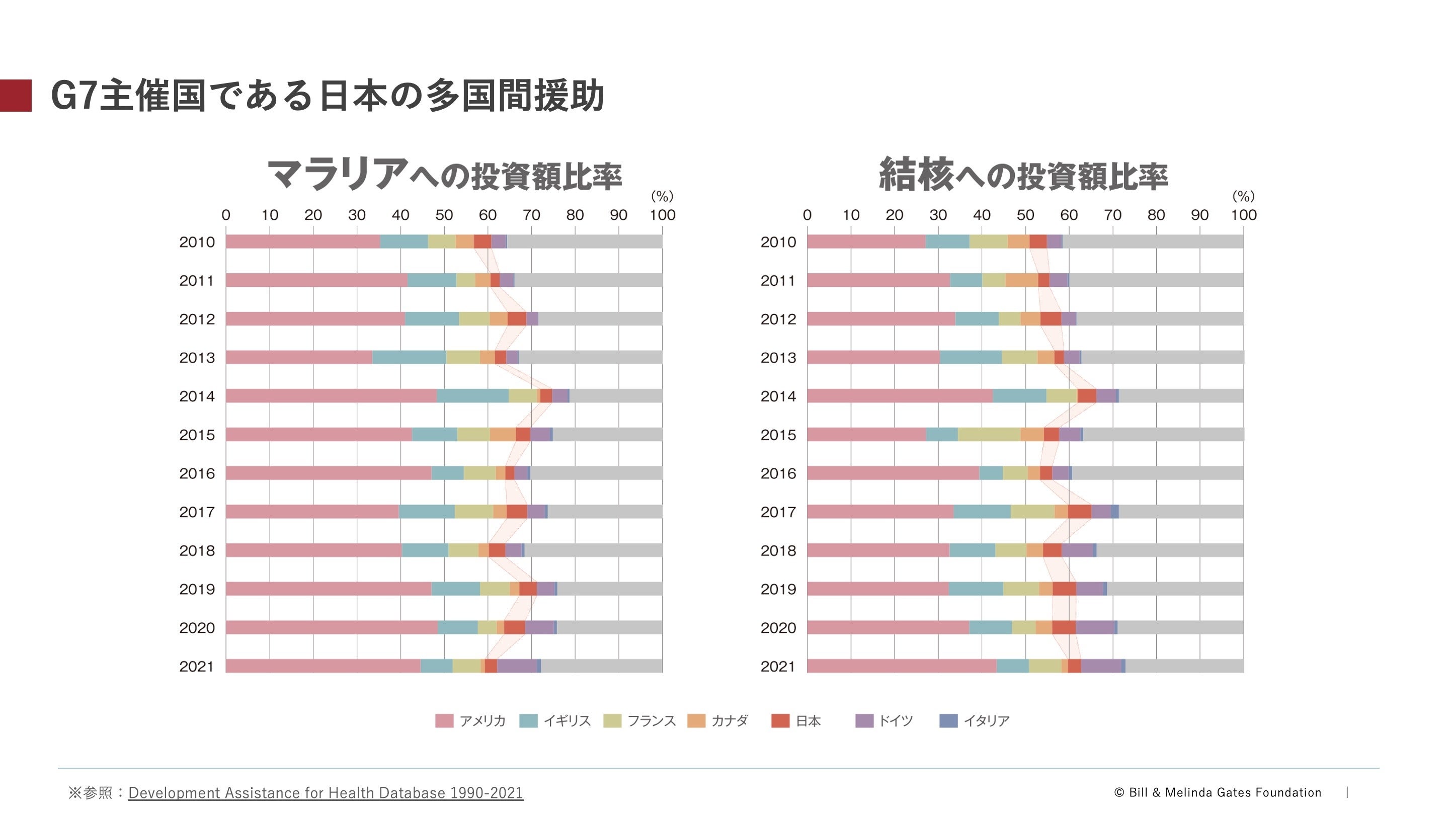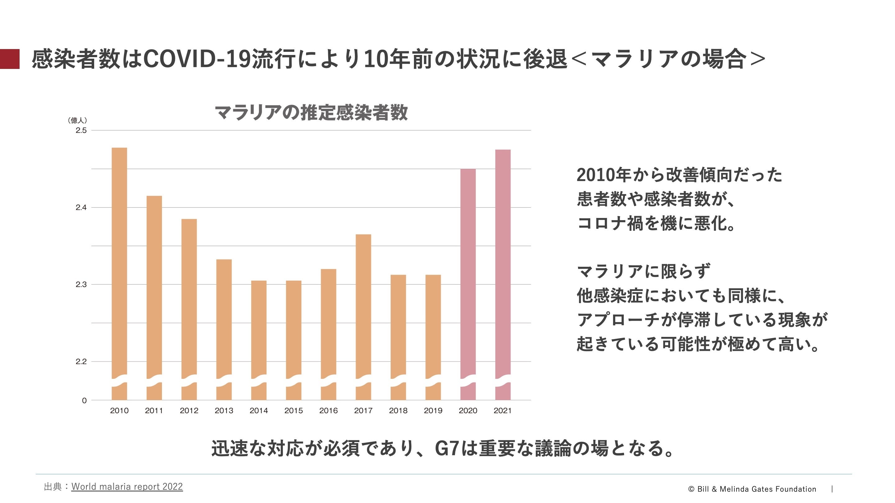 ビル&メリンダ・ゲイツ財団もCOVID-19が流行した当初、警鐘を鳴らしていましたが、世界の注目がCOVID-19に一極集中してしまうことによって、他の感染症の対策が遅れてしまいました。マラリアの場合は、10年前の水準にまで後退してしまっています。これは、マラリアだけではなく、他の感染症も同様のことが起きていると考えられ、今年5月に広島で開催されるG7においても、既存の感染症を含めて、COVID-19を踏まえた世界の教訓、そしてグローバルヘルス分野の重要性について、改めて議論をしていくべきです。