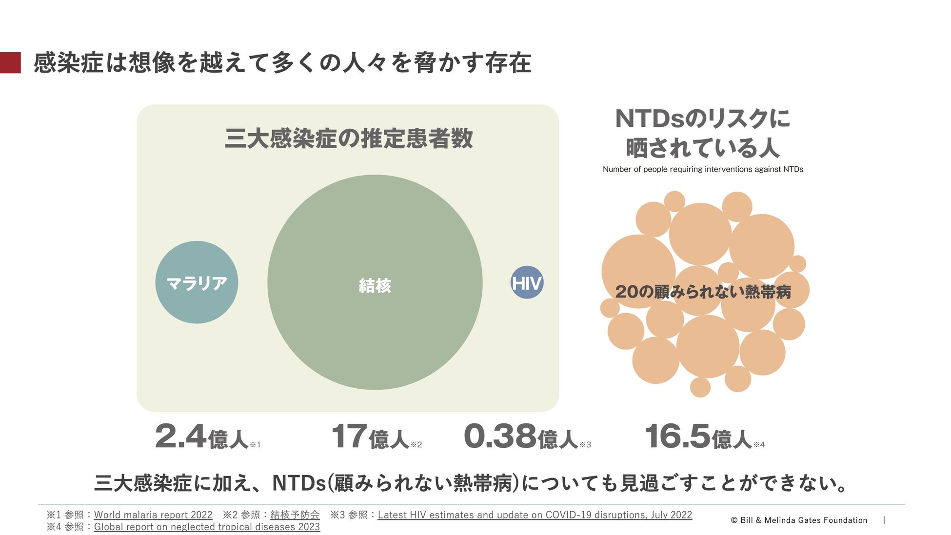 三大感染症の推定患者数については、マラリアは2.4億人、 結核は17億人、HIVは3,800万人と推定されています。また、WHOが指定する20の顧みられない熱帯病は、リスクに晒されている人口が16.5億人といわれており、世界では三大感染症やNTDsなどのリスクに非常に多くの人々が晒されている実情があります。