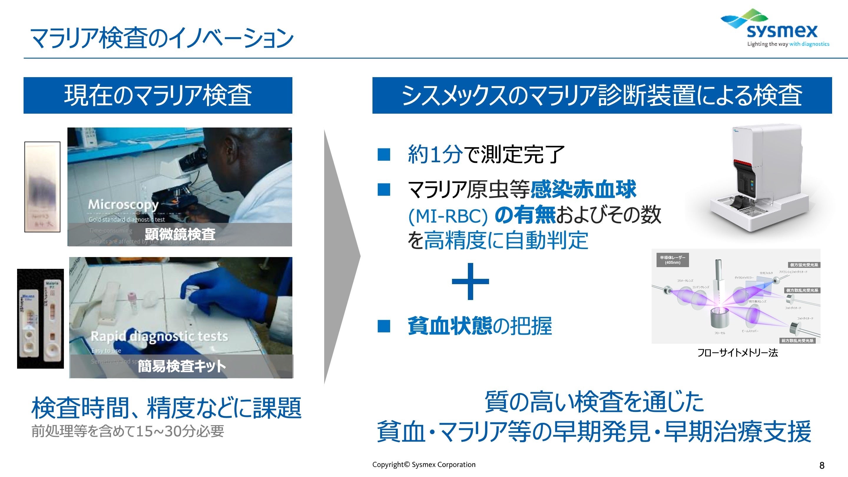 グローバルヘルスにおいては、「現地の医療課題にどう向き合うか」が重要です。例えば、マラリアは、アフリカや東南アジアを中心に年間約2.5億人が感染し、死者62万人のうち約50万人は5歳以下の乳幼児という状況です。マラリア蔓延地域には貧血患者も多く、マラリアの診断と合わせて、ヘモグロビンの量を測定し貧血状態の把握をすることも必要です。シスメックスは、グローバルNo.1のシェアをもつ血球計数検査で培った技術を活用し、多くの人たちの検査を迅速にできるマラリア検査機器を開発しました。日本の健康診断のような仕組みが普及していない開発途上国において、病気の早期発見・早期治療の仕組みを作ることにチャレンジしています。