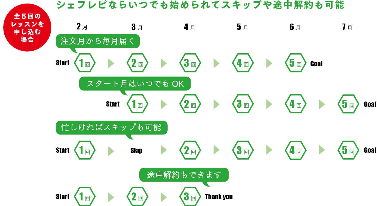 「信頼できるシェフの動画で学ぶ」「食材がすべて分量分だけ届く」といったサービスの機能自体は変わっていません。しかし同じテーマのレッスンを複数回積み重ねていくことで、1度の料理体験では得られなかった学びが得られるだけでなく、覚えたことを応用する機会も生まれます。