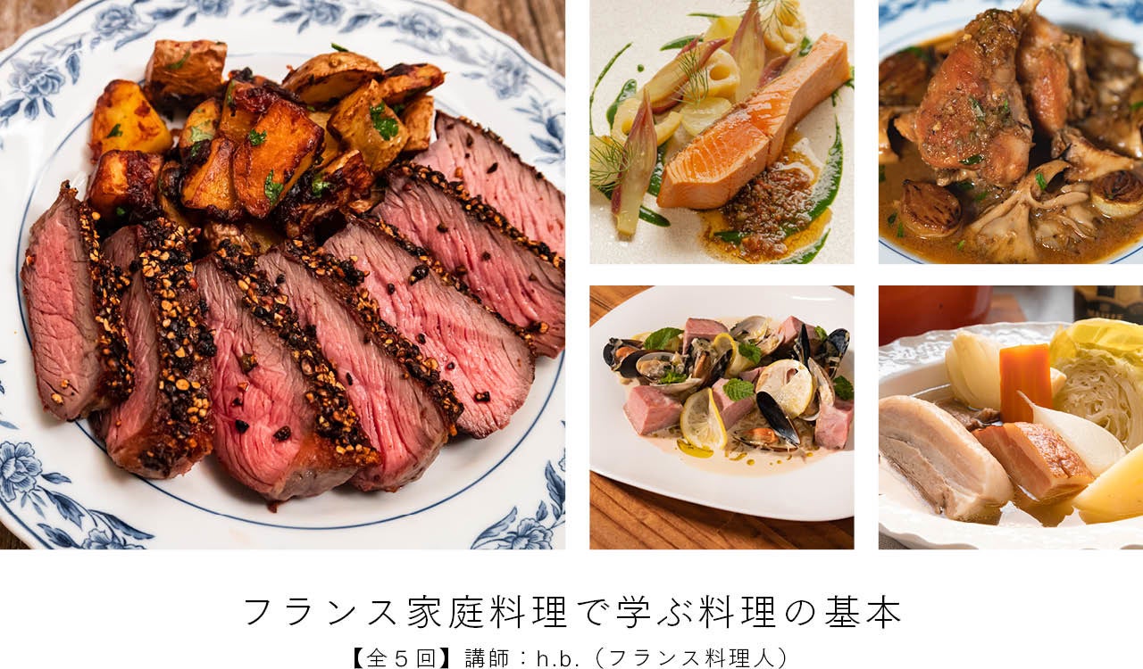 フランスの家庭やビストロで出てくるような料理から肉や魚の焼き方、ブレゼ(蒸し煮)、煮込みといったフレンチ以外でも使える基本的な調理法を学びます。扱う食材も牛肉、豚肉、サーモン、ウサギ肉と多様です。