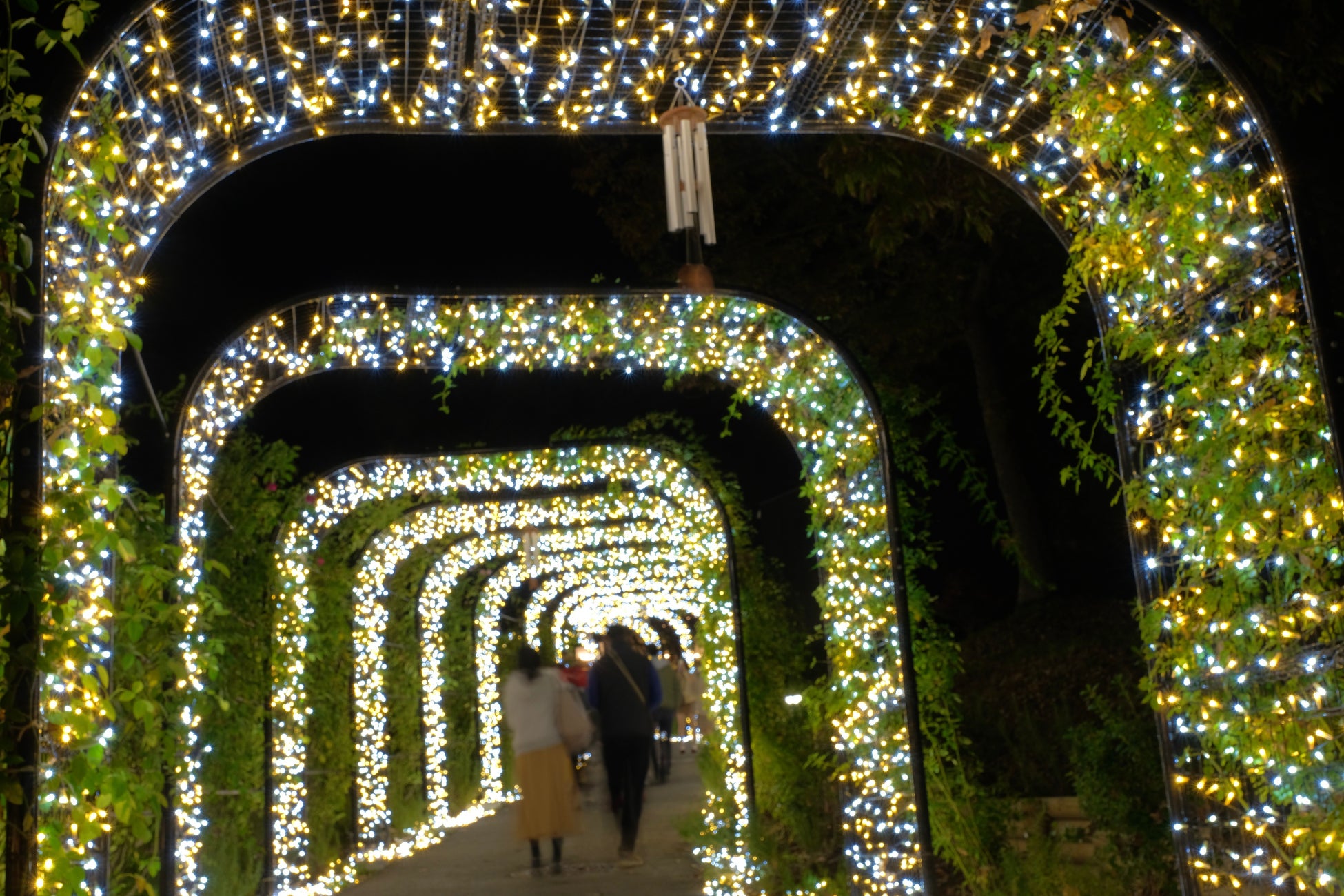 園内に入ると、最初に現れるのが、約60メートルに及ぶ光の回廊。バラのトンネルを装飾したキラキラと輝く回廊で、光に包まれながら奥にいざなわれると、別世界へとトリップした気分に。