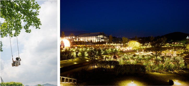 レストランに面するグリーンヒルのうえにある、まるでハイジのような「星空ブランコ」。光の道に導かれて丘をのぼり、ライトアップされた大きな樹に吊るされたひかるブランコに乗ると、満天の星空にダイブするような浮遊感を味わえます。レストランのテラスに灯された焚き火やイルミネーションを一望し、暗闇のなかに浮かぶ幻想的なあかりを独り占めしてください。