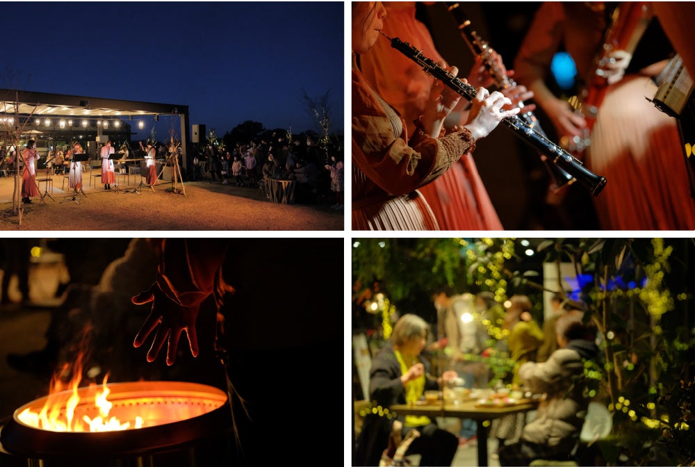 イルミネーションの初日となる11月12日(土)は、17時の点灯に合わせて点灯式を開催します。焚き火が灯されたレストランのテラスでは、光の演出でもある「花」「星」「風」をテーマにしたミニコンサートを開催。レストランのグルメと一緒に、炎の揺らぎと癒しの音楽で心やすまる時間を味わってください。