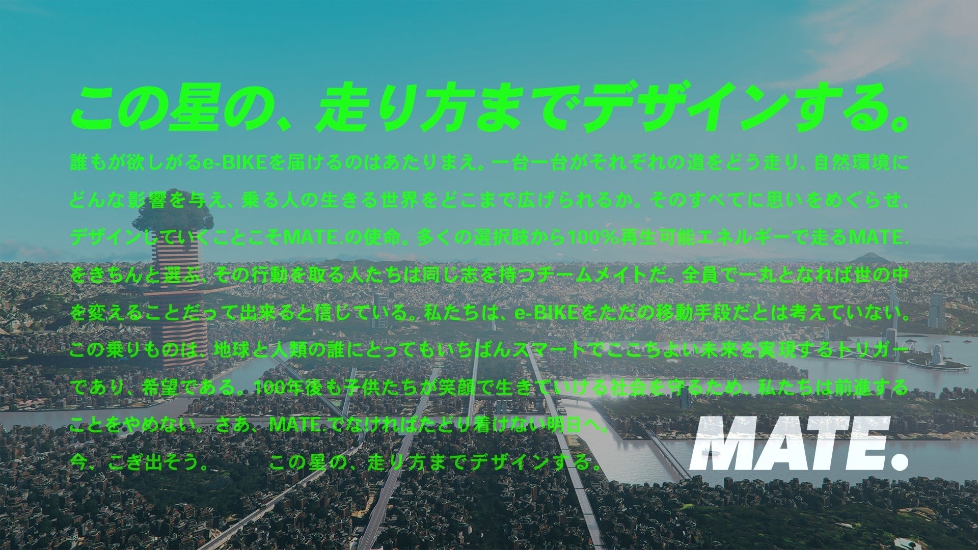 日本市場でのさらなる成長と社会貢献を追求していく姿勢を『この星の、走り方までデザインする。』という言葉に込め、お客様をはじめ、MATE. BIKEに関わるすべての人たちと共有したいと考え、ステートメントとともに発表いたします。