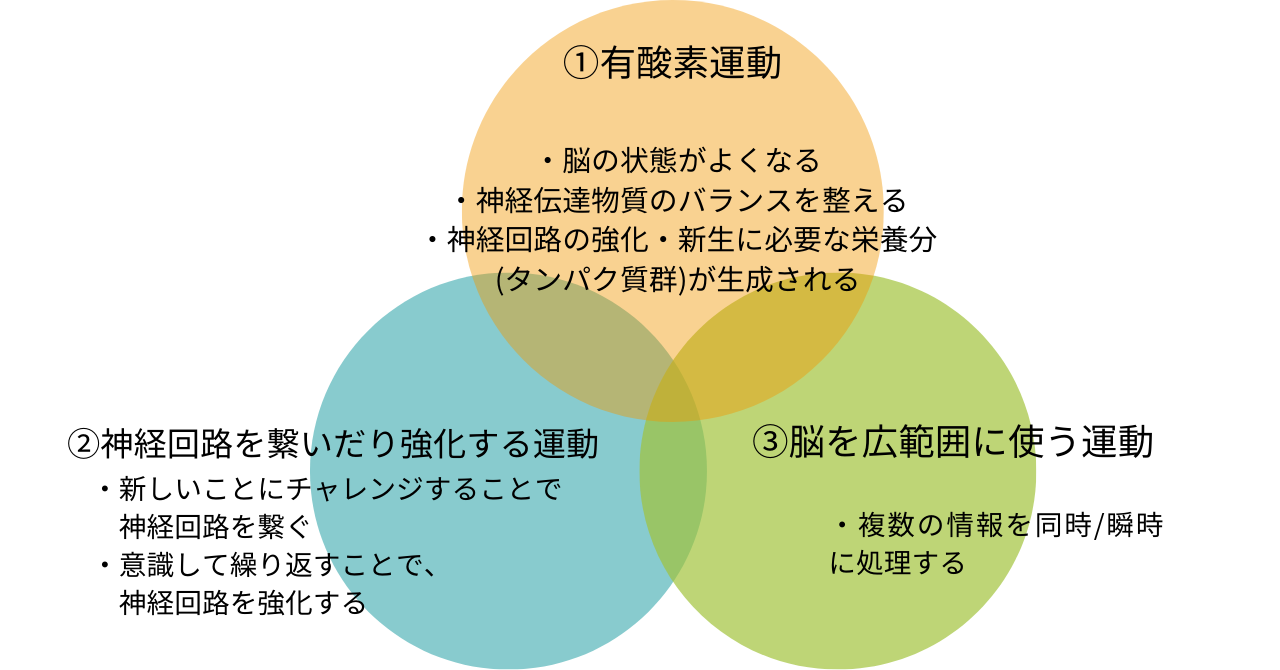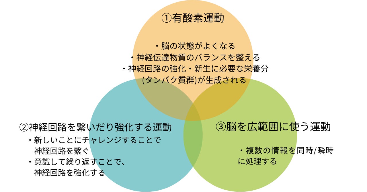 ①有酸素運動→脳を目覚めさせ、神経伝達物質(ドーパミン、セロトニン等)のバランスを整える。また、神経回路の強化・新生に必要な栄養分が生成される
