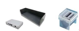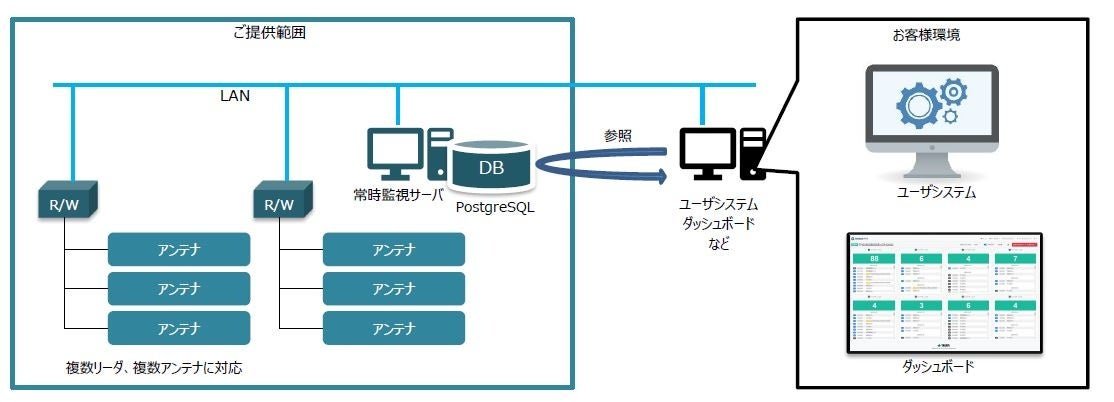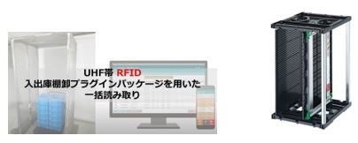 半導体ウェハ容器の他、書類やPCなどの備品を棚の上に”置くだけ”で読み取るデモを、棚用リーダライタ(UTR-SUN02V-8CH)とアンテナ(UTR-BSA901)と「常時監視ミドルウェア」のセットで実演します。