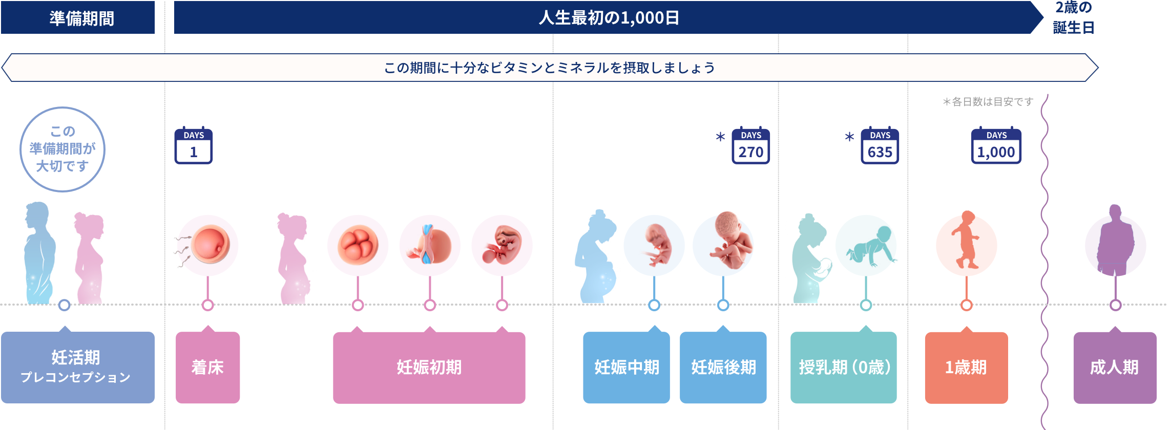 ママのおなかの中で受精卵が着床してから赤ちゃんが生まれて2歳の誕生日を迎えるまでを指し、この期間に赤ちゃんにしっかりと栄養を与えてあげることが、赤ちゃんの成長や将来の学ぶ力の基礎をつくり、成人期までの健やかな成長を促します。バイエル薬品では、この期間を夫婦と赤ちゃんにとって大切な出発点と位置付けており、「エレビット®」を通じてその栄養の重要性について認知を高めるためのさまざまな取り組みを展開しています。