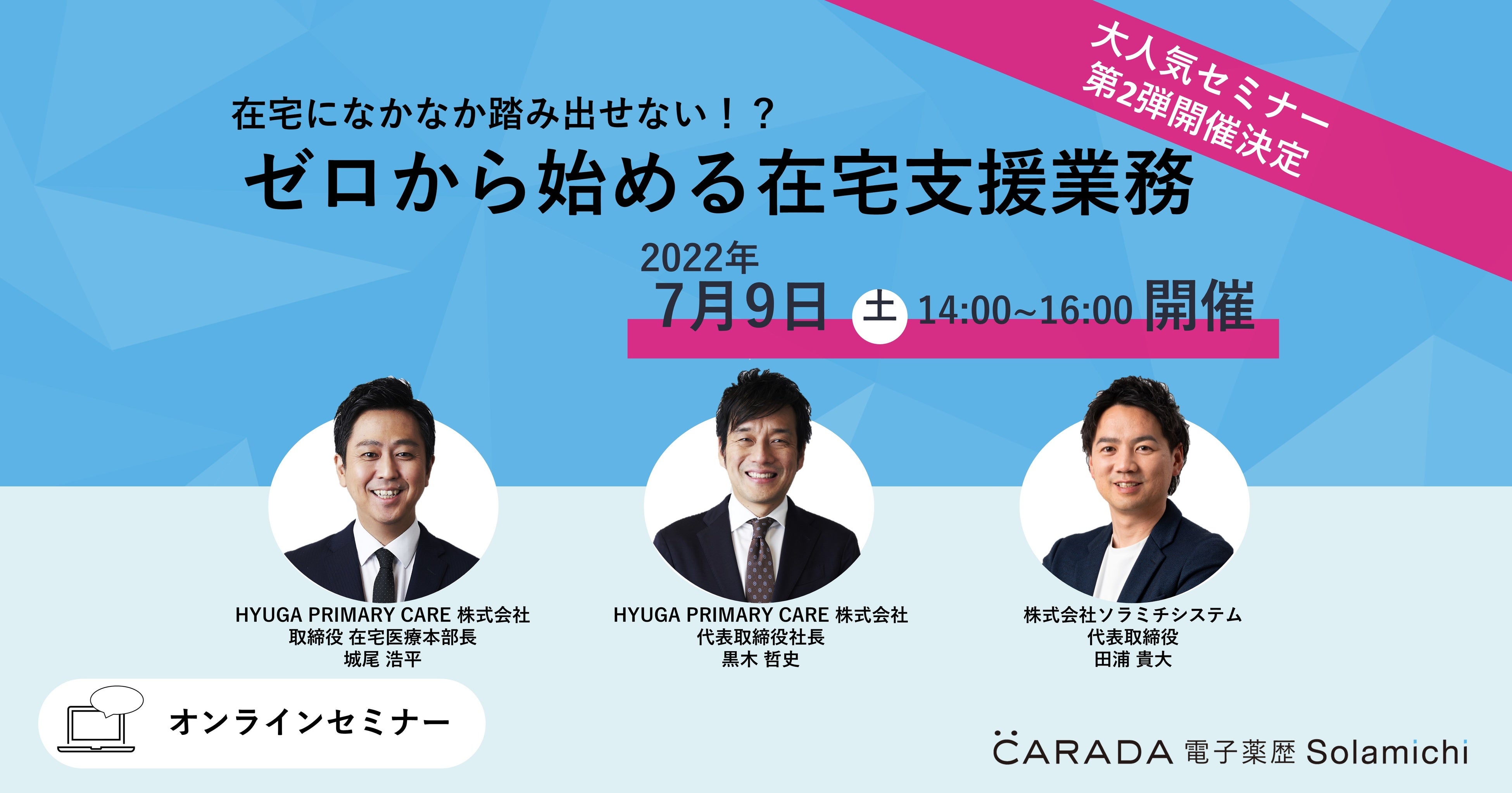 クラウド電子薬歴『CARADA 電子薬歴 Solamichi』の企画・開発・販売を行う株式会社ソラミチシステムは、薬剤師による在宅訪問、在宅訪問薬局のサポート事業を展開するHYUGA PRIMARY CARE株式会社の代表取締役社長 黒木哲史氏と城尾浩平氏をゲストに迎え、無料オンラインセミナー「ゼロから始める在宅支援業務」を2022年7月9日(土)14時に開催します。
