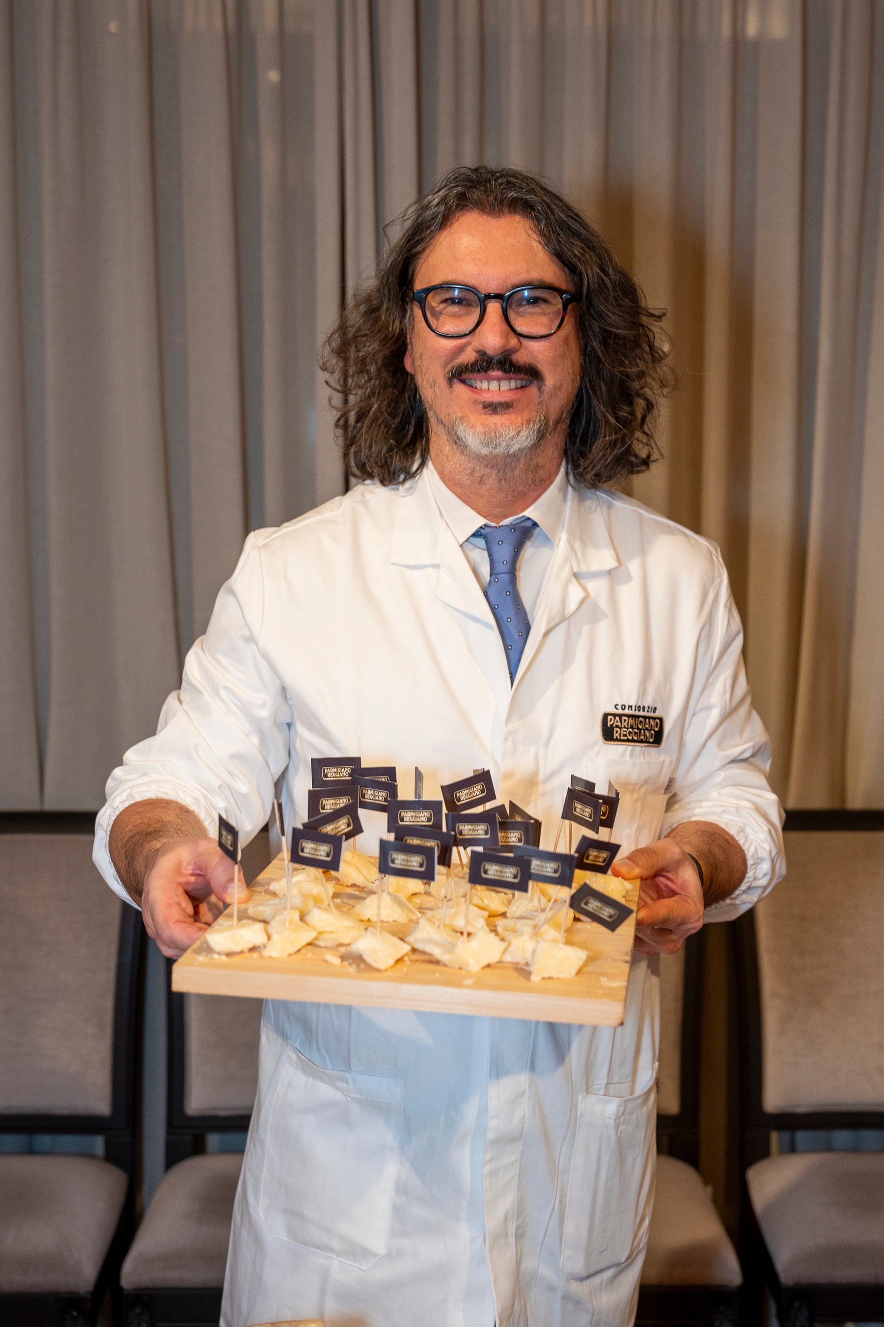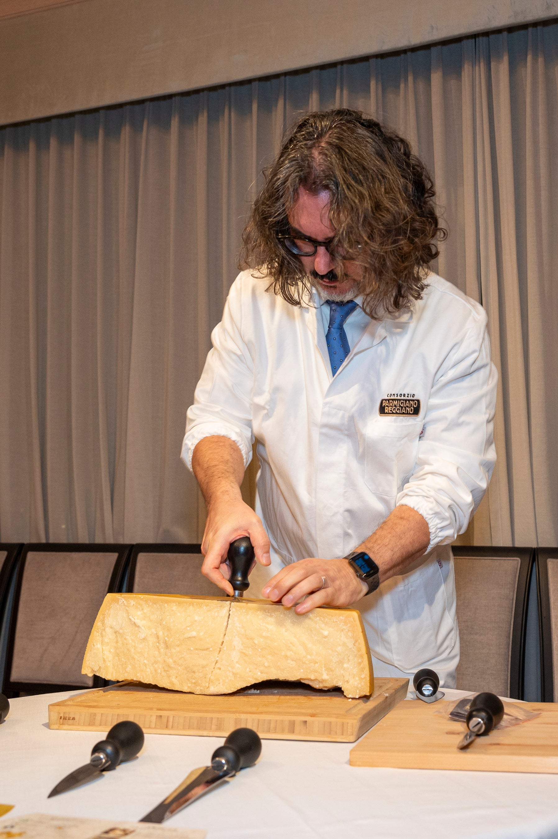 1934年に設立されたパルミジャーノ・レッジャーノ・チーズ協会は、イタリア最古の食品の保護協会で、今年設立90周年を迎えます。イベントでは協会のシモーネ・フィカレッリが「イタリアチーズの王様」の塊を伝統的なナイフで「割る」パフォーマンスを披露し、下記のようにコメントしました。