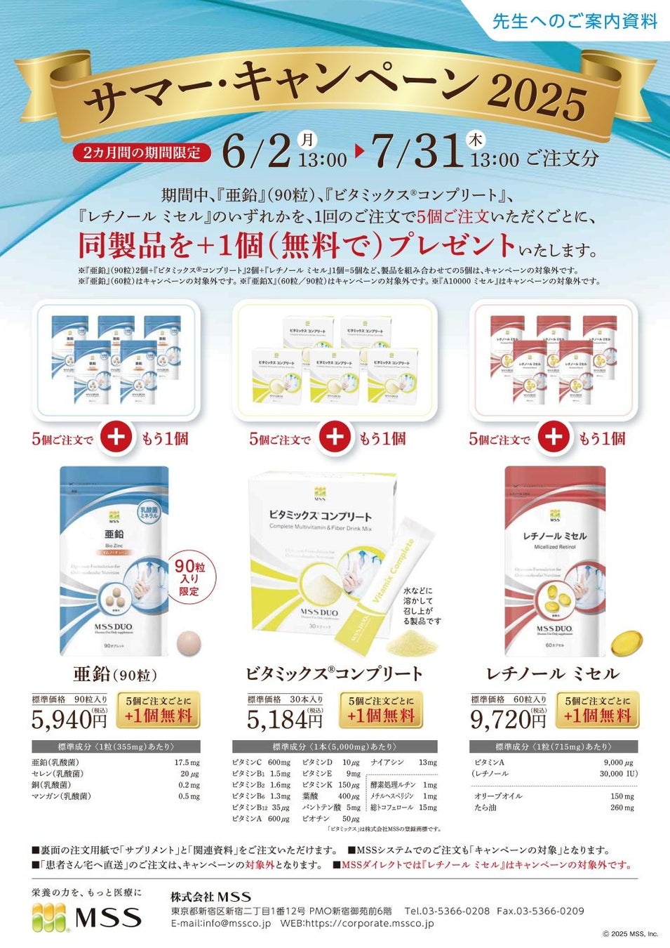 医療機関専用サプリメントの開発・製造・卸販売のほか、医療機関におけるオーソモレキュラー栄養療法の導入・実践をトータルサポートする株式会社MSSでは、2025年6月2日(月)13:00~7月31日(木)13:00まで、「サマー・キャンペーン 2025」を開催しています。