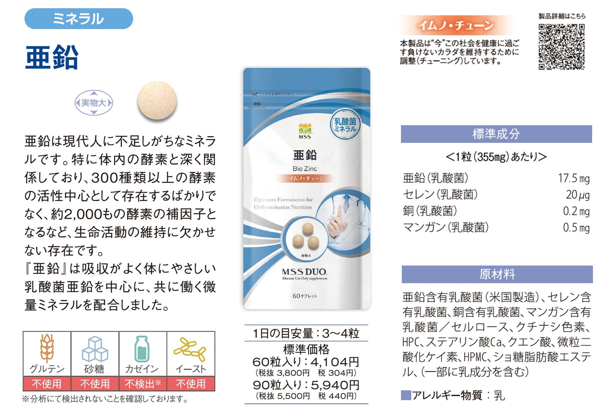 ・MSSの『亜鉛』(90粒)は、亜鉛サプリメント特有の「ムカムカ」が起こりにくく、吸収性に優れた「乳酸菌ミネラル」を採用しています。
