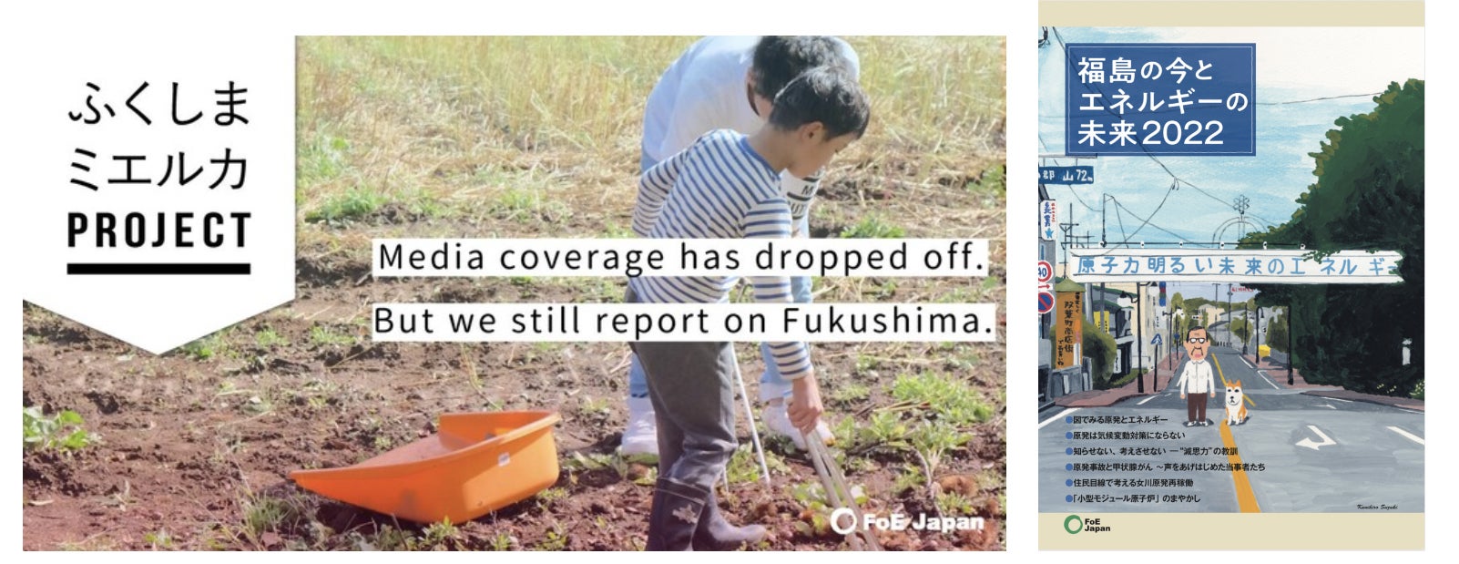 着実に進む事故の風化。同時に、原発事故被害の「見えない化」も進んでいます。FoE Japanでは、原発事故から10年目を迎える2020年、事故被害を「見える化」し、国際的に情報を発信していく「ふくしまミエルカPROJECT」(https://311mieruka.jp/)をはじめました。事故によって避難、帰還、居住継続している人たちなどのインタビュー映像や、事故被害やエネルギー政策をめぐるデータなどを集めた特設サイトを作成。また年に一回、これまで執筆したものをまとめた冊子「福島の今とエネルギーの未来」(https://foejapan.org/issue/20220325/7060/)の発行や、国際シンポジウムの開催などを行っています。