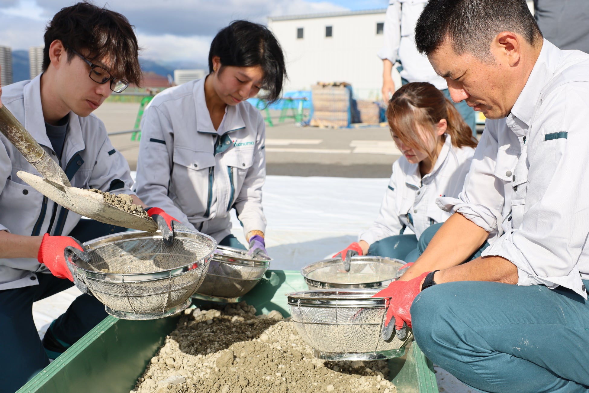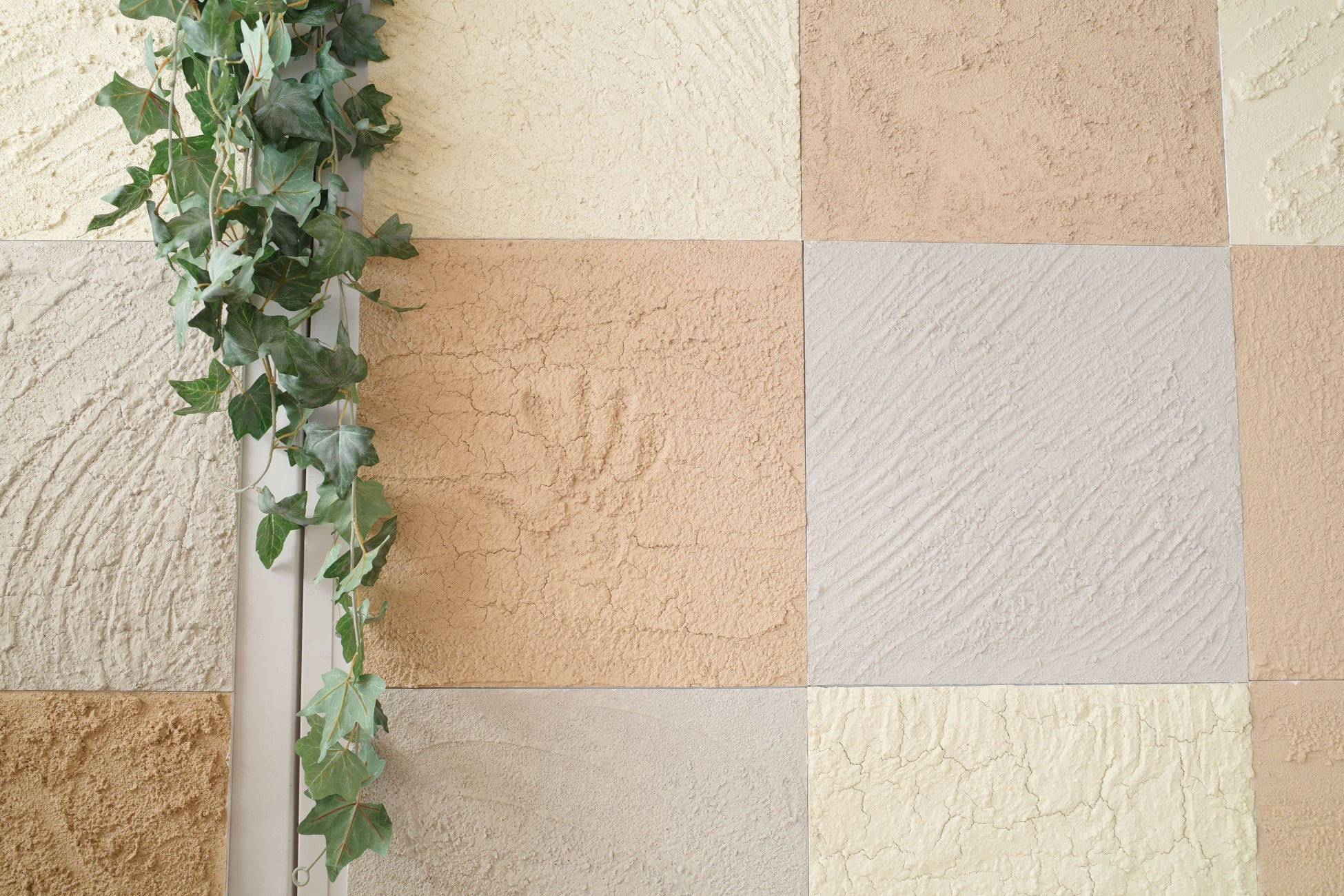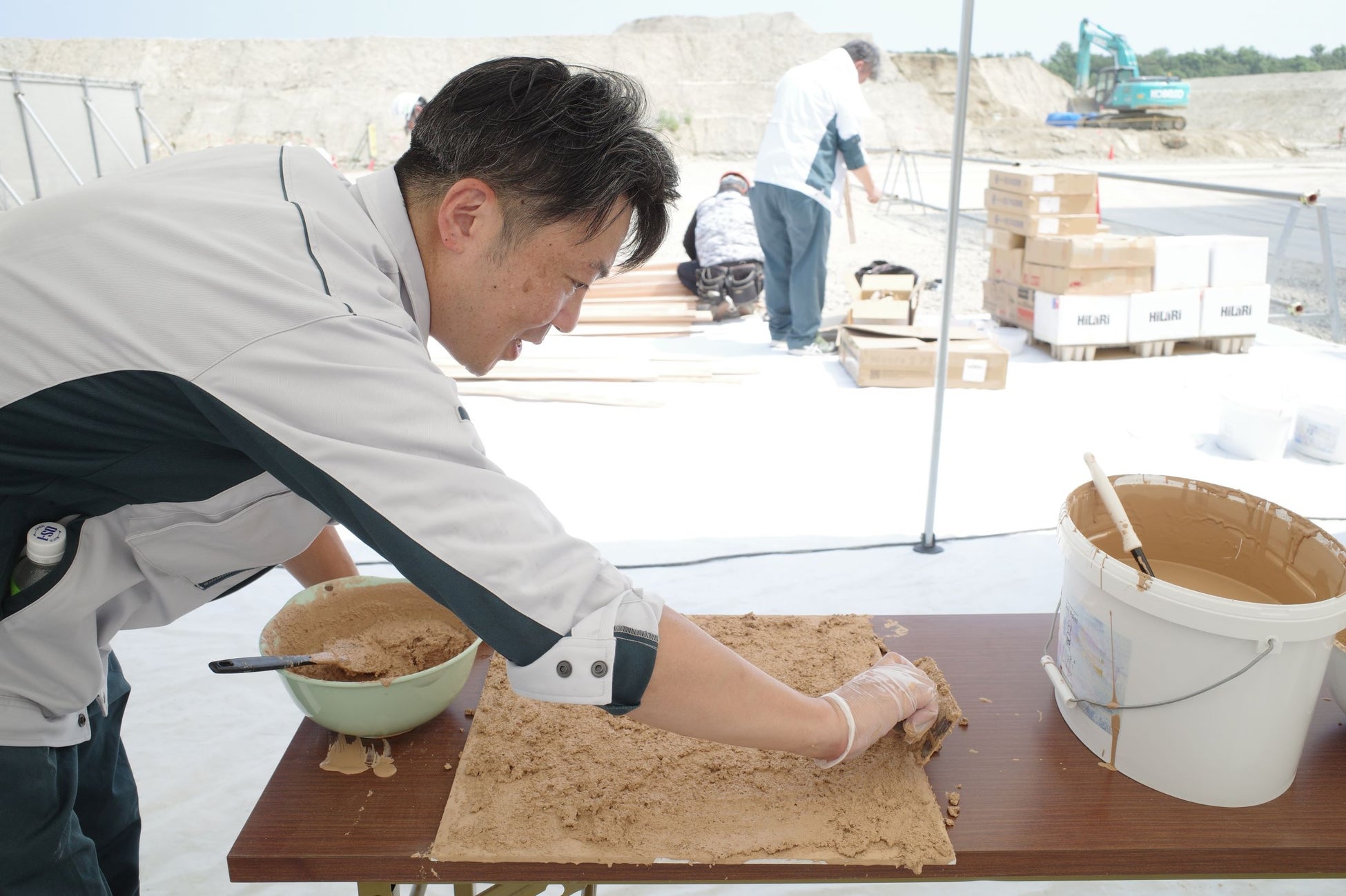 工事現場では、地下躯体・基礎工事を施工するなどのために土を掘削しますが、その土は建設発生土としてダンプを使用して集積場へ運搬されます。運搬時には多くのCO2が排出され、環境に影響を及ぼす懸念があります。本取り組みでは、この建設発生土と、自然由来の素材・粘土からできたカラーペイント材を混合し、450mm角などのケイ酸カルシウム板に塗布した「土壁パネル」を作成しました。