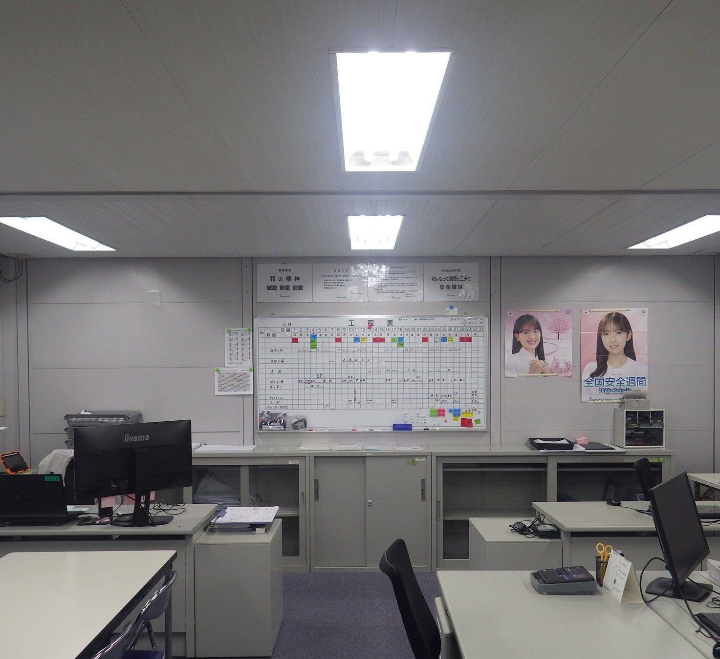 工事現場の事務所は一時的な利用に留まるため、現地に仮設のコンテナハウスを設置することが一般的です。総合建設会社である当社は、全従業員の5割ほどが現場業務に従事しており、その中でも多くの人が、コンテナハウス内で事務作業を行っています。無機質なコンテナハウスの内装を「Wellness Container」により生まれ変わらせることで、以下の目的を実現します。