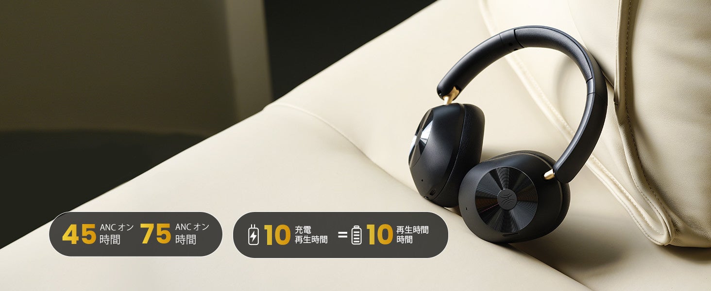 一度の充電で最大75時間の音楽再生が可能(ノイズキャンセリングOFF時)。また、急速充電機能により、10分間の充電で約10時間の再生が可能です。これにより、短時間の充電で長時間の使用が可能となり、外出時のバッテリー切れの不安を解消します。さらに、音量30%の設定では最大90時間の再生が可能で、長時間の旅行や連続使用にも対応します。