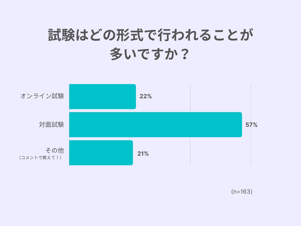 対面試験(57%)が最も多くの割合を占め、オンライン試験(22%)を上回る結果となりました。その他(21%)にはレポート等の形式がコメントで挙げられています。
