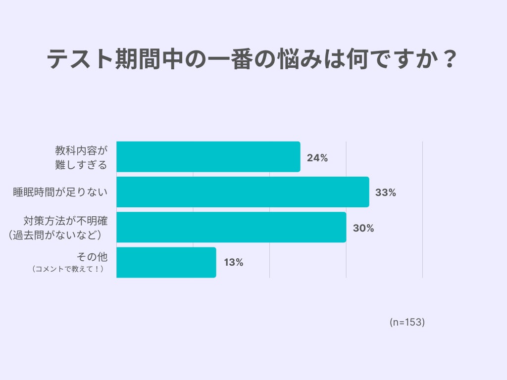 大学生が試験期間中に最も悩むことが睡眠時間が足りない(33%)ことであり、2位以降に対策方法が不明確(30%)、教科内容が難しすぎる(24%)が続きました。