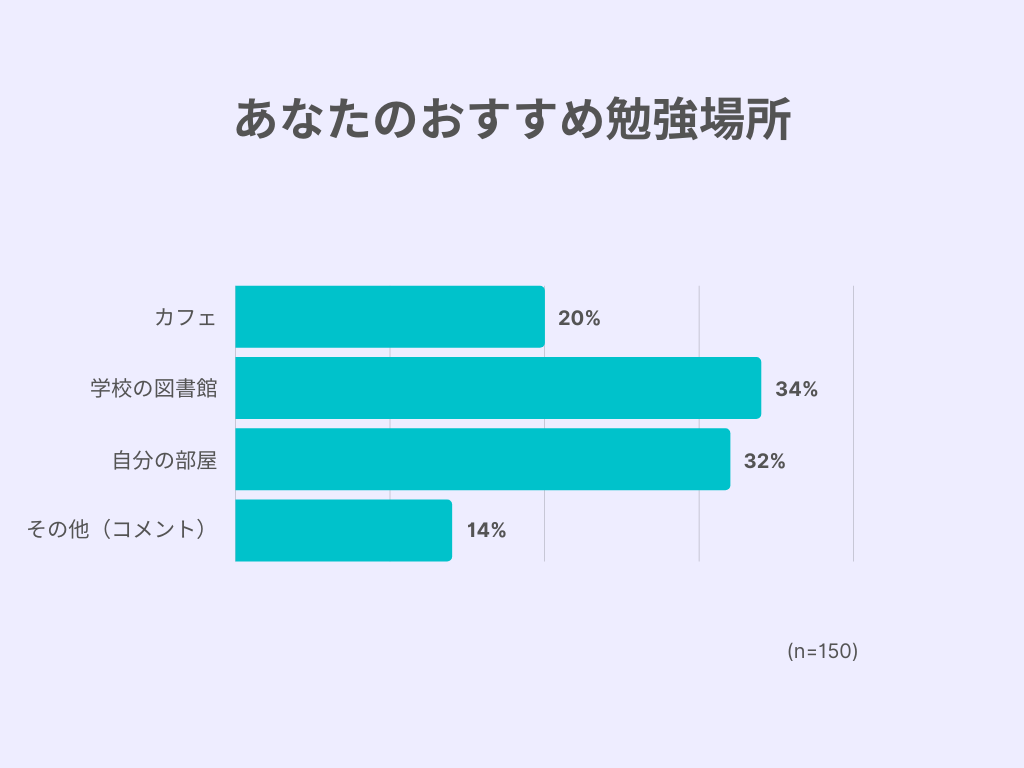おすすめの勉強場所について、最も多くの大学生が学校の図書館(34%)を挙げました。また、自分の部屋(32%)で勉強する学生もおり、1位と同程度の割合を占めています。カフェ(20%)で勉強する大学生は、他2選択肢に比べて少ない結果となりました。