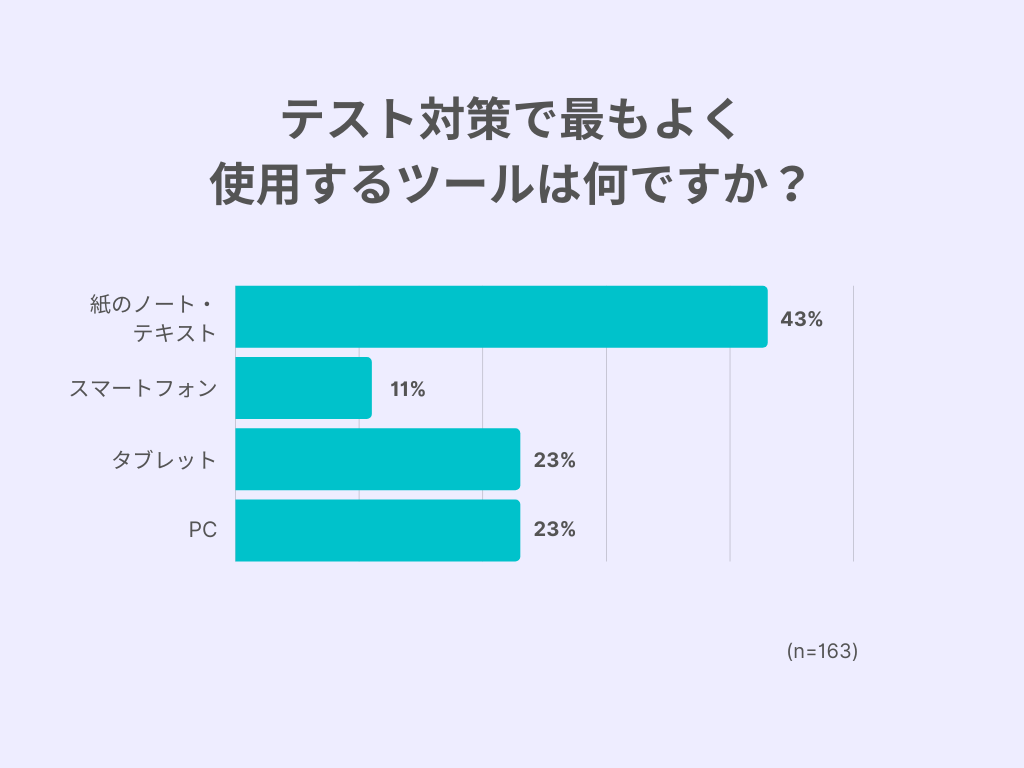 ・大学生が試験対策によく使用するツール1位は紙のノート・テキスト(43%)、同率2位はタブレット(23%)およびPC(23%)