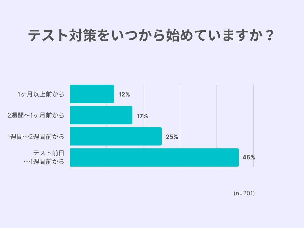 ・約半数の大学生がテスト前日〜1週間前(46%)といった受験直前から試験対策を開始する