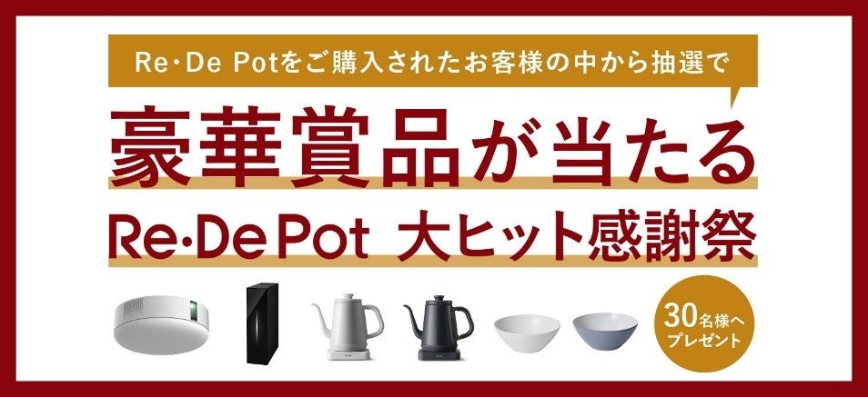 「Re・De」は、製品としての「モノ」と、レシピや佇まい・デザインから生まれる「コト」が掛け合わさってできる世界観をもって、心地をリ・デザインし、新しいライフスタイルを提案するブランドです。 この度、”たった25分で、毎日特別ごはん”がコンセプトの電気圧力鍋「Re・De Pot」大ヒットの御礼と、日頃ご愛顧いただいている皆様への感謝の気持ちを込めて、豪華賞品が当たるキャンペーンを開催いたします。