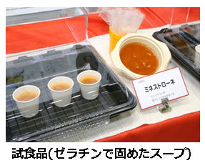 試食品としてミネストローネとクラムチャウダーのスープをゼラチンニューシルバーで固めた試食品を電子レンジで加熱して、ご来場のお客様に召し上がっていただきました。