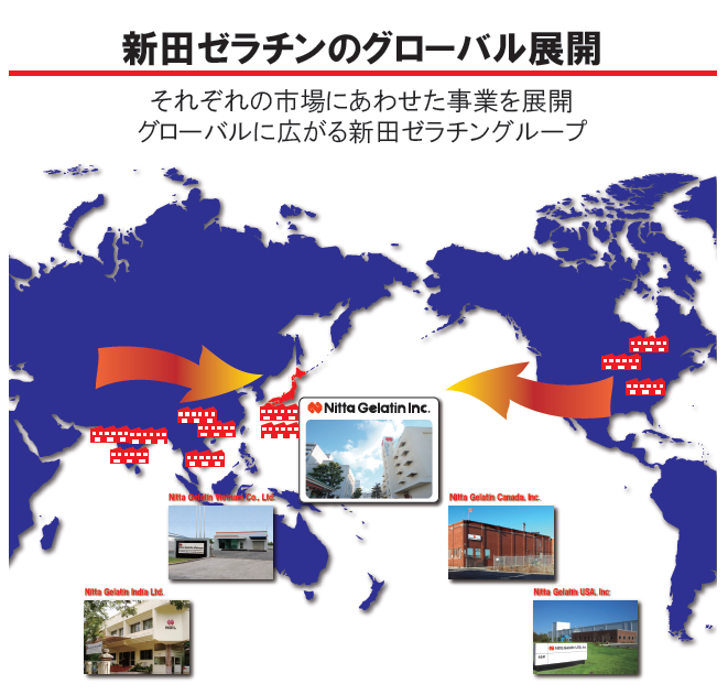 弊社は、日本国内市場シェア約60%を持つゼラチンメーカーで、ゼラチン、コラーゲンペプチド等の原料調達から商品企画、研究開発、製造、販売まで一貫した生産販売体制の構築により、お客様への安定した製品供給と高い品質の維持を実現しています。これにより国内外のお客様から高い評価と信頼を得ていることが当社の強みです。生産拠点が日本のほか5カ国にあり、各国市場の動向やお客様のニーズに合った製品をいち早くお届けしています。