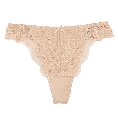 ウエストサイドにもレースを使用。アウターにも響きにくく、Tバックスタイルでヒップの丸みをキレイに見せる。