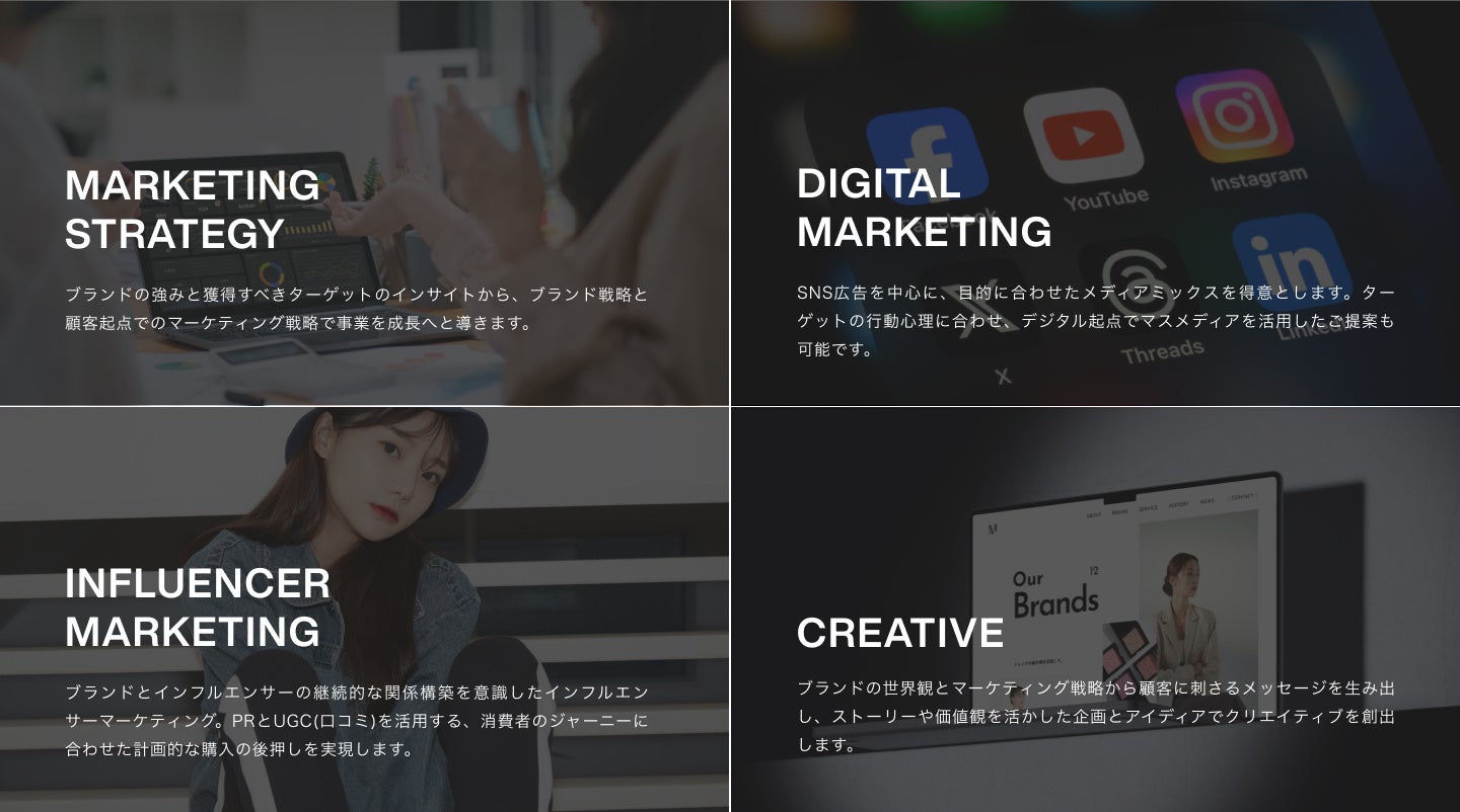 マーケティングのスペシャリストとして、ブランド体験(BX:Brand Experience)を通してブランドが永続することを真価とし、顧客から選ばれ続けるブランドへの成長支援を行うBrand Creations Companyのポジションを確立。企業の売上拡大や利益最大化を目的に、事業成長(KGI)と施策完遂(KPI)にコミットし、1社完結型の支援体制で「売れる仕組みづくり」を実現。