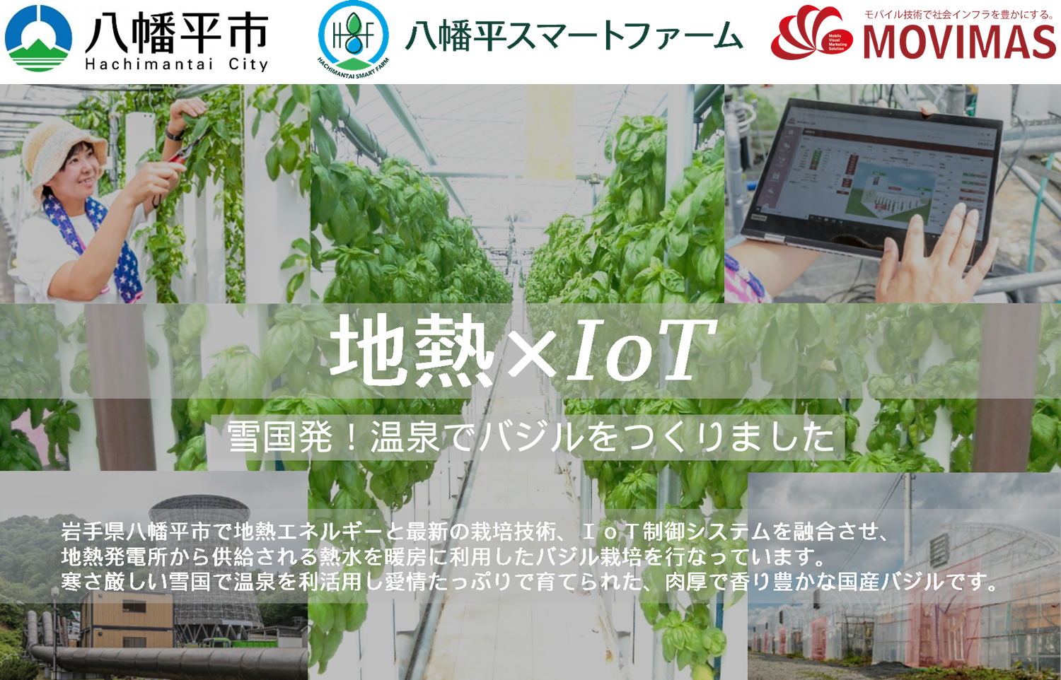 あらゆるモノがインターネットにつながる「IoT」を活用したクラウド制御システム開発を手掛ける株式会社MOVIMAS(モビマス、本社:東京都千代田区、代表取締役:兒玉則浩、以下MOVIMAS)は、地熱を活用した熱水ハウスを再生する岩手県・八幡平市(市長:佐々木孝弘、以下八幡平市)のIoT農業の振興を目的とした協定締結から、農地法に定める農地所有適格法人として設立した株式会社八幡平スマートファーム(本社:岩手県八幡平市、代表取締役:兒玉則浩、以下八幡平スマートファーム)は、IoT技術と地域資源を活用した循環型社会の創造において、日本で初めて商用稼働した松川地熱発電所の温水で通年栽培する二酸化炭素(CO2)を月に約230トン排出を減らす「温泉バジル」出荷拡大による、脱炭素に向けた取組みの一環として、ECサイトのオープンを決定いたしましたので、お知らせします。